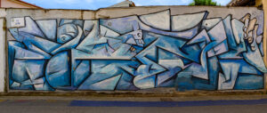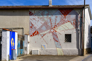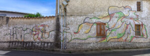 Murale de Luigi Pu 1996 avec une inscription à demie effacée : Pays d’Art Pays de Paix. Ses 7 palomas de la paix se libérant de l’écheveau complexe et tortueux du sombre monde géométrisé par les algorithmes crochus et s’envolant sur la portée musicale des rayons bleus du soleil. ( quête spirituelle ? )