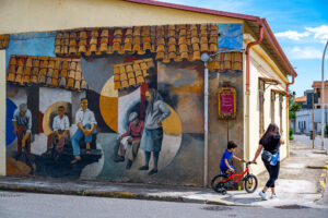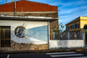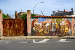 Via Sassari, belle et grande fresque de Angelo Pilloni, artiste déjà rencontré sur les murs de Tinnura, à l’épisode précédent. Natif de San Sperate, auteur de nombreuses fresques ici et ailleurs. Très engagé dans la représentation de l’identité sarde. Si les couleurs paraissent fraîches, c’est qu’elle a été réhabilitée et plusieurs fois, la dernière paraissant datée de 2022.