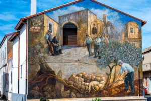 🔎Je vais tenter un descriptif maladroit sans doute et à coup sûr incomplet. Cette fresque rassemble les valeurs et les réalités patrimoniales du pays Sarde. En haut à droite, à travers les rues du village surgit une longue procession précédée par des porteurs du Saint vénéré, suivi de l’évêque, des porteurs de bannières et de la foule ; avec en fond la silhouette carrée et rustique de la tour/clocher de l’église de style aragonais, reproduction de la Chiesa di San Sperate Martire du village. On peut donc déduire que le saint honoré et promené est bien Speratus, un martyr de Scillum en Numidie, décapité à Carthage avec 12 autres le 17 juillet 180 après J.-C., dont les reliques auraient été transportées au VIè siècle dans l’ancienne Civitas Valeria afin qu’elles ne soient pas profanées par les Vandales.