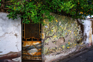 NB : Je ne peux décoder aisément le motif en haut à gauche sur le mur, j’y lis une paire de mains ouvertes offrant ce qui pourrait être des pêches de San Sperate ou des oeufs, ou des pommes de terre ??? 🤪