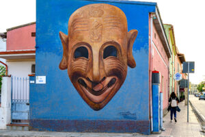 Mention particulière pour cet étrange masque grimaçant conservé et exposé au Musée Archéologique National de Cagliari, mais trouvé ICI, reproduit d’ailleurs sur d’autres murales de San Sperate.