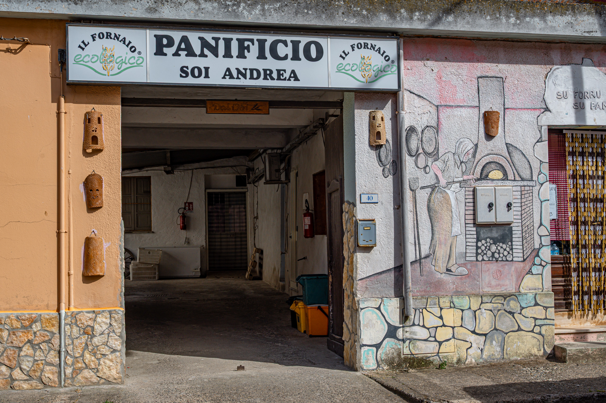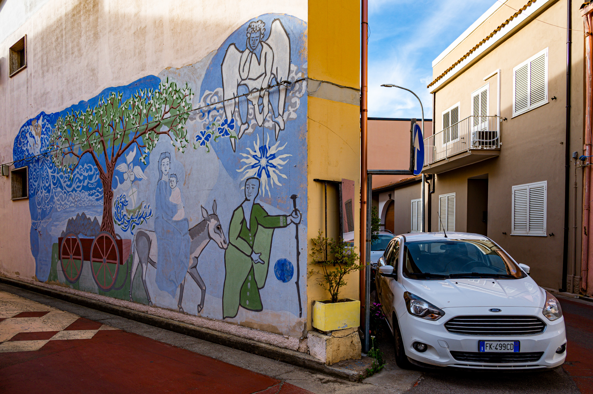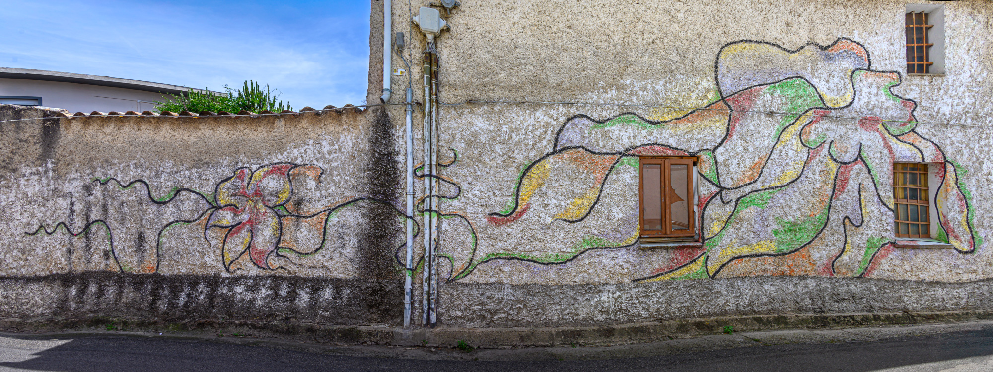 Via Sassari, belle et grande fresque de Angelo Pilloni, artiste déjà rencontré sur les murs de Tinnura, à l’épisode précédent. Natif de San Sperate, auteur de nombreuses fresques ici et ailleurs. Très engagé dans la représentation de l’identité sarde. Si les couleurs paraissent fraîches, c’est qu’elle a été réhabilitée et plusieurs fois, la dernière paraissant datée de 2022.