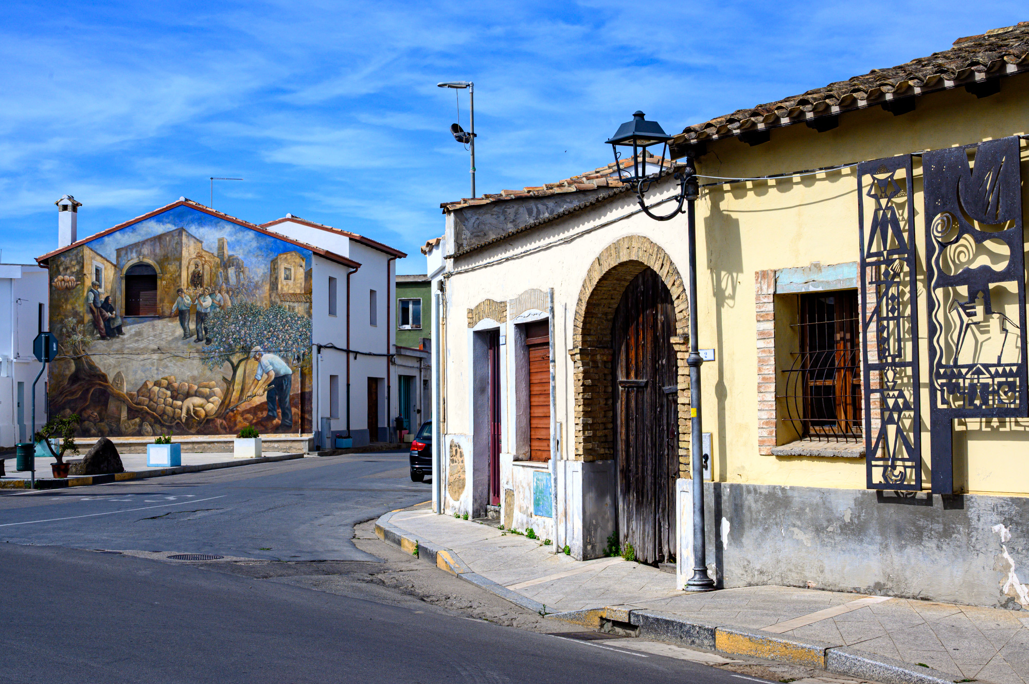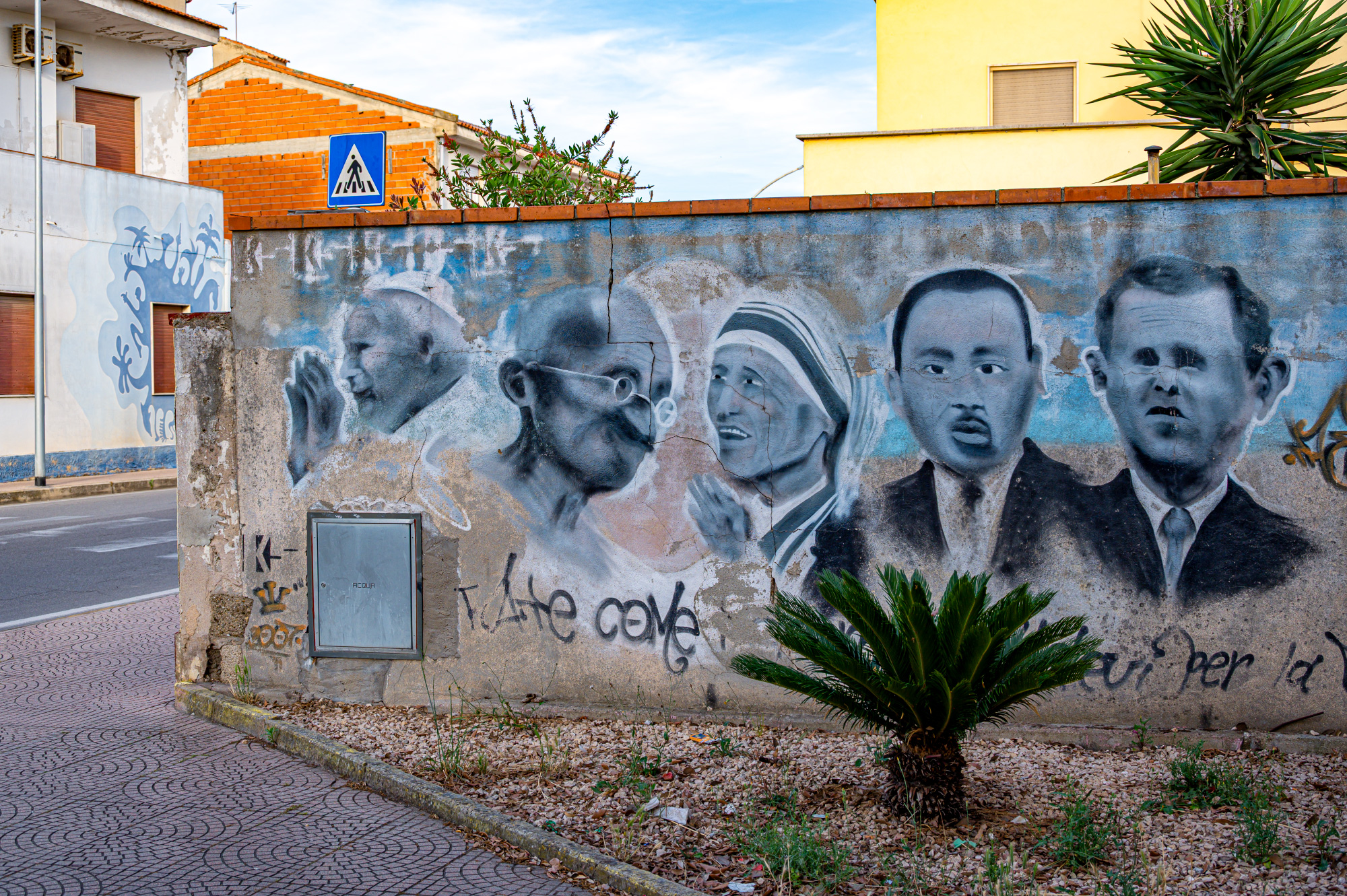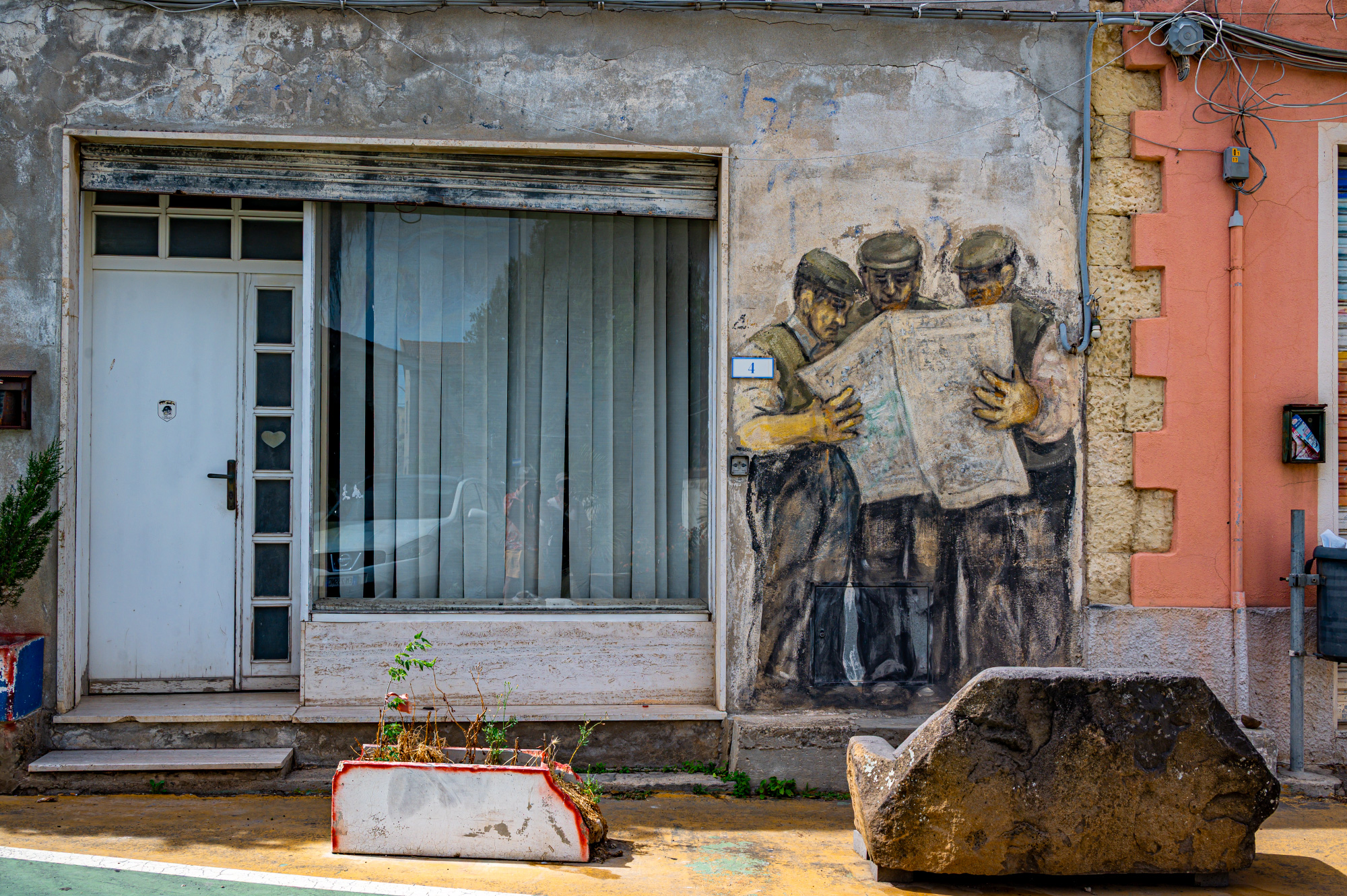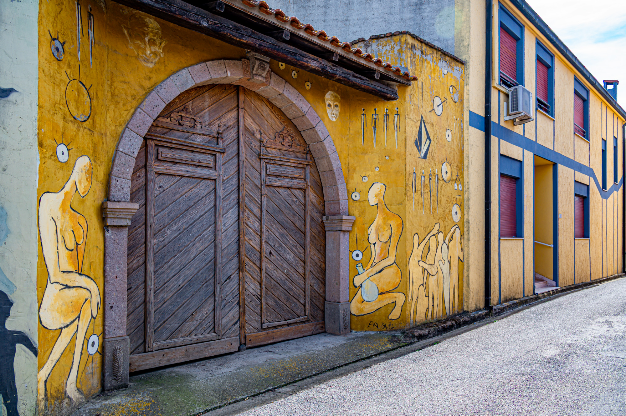 Via Sassari, belle et grande fresque de Angelo Pilloni, artiste déjà rencontré sur les murs de Tinnura, à l’épisode précédent. Natif de San Sperate, auteur de nombreuses fresques ici et ailleurs. Très engagé dans la représentation de l’identité sarde. Si les couleurs paraissent fraîches, c’est qu’elle a été réhabilitée et plusieurs fois, la dernière paraissant datée de 2022.