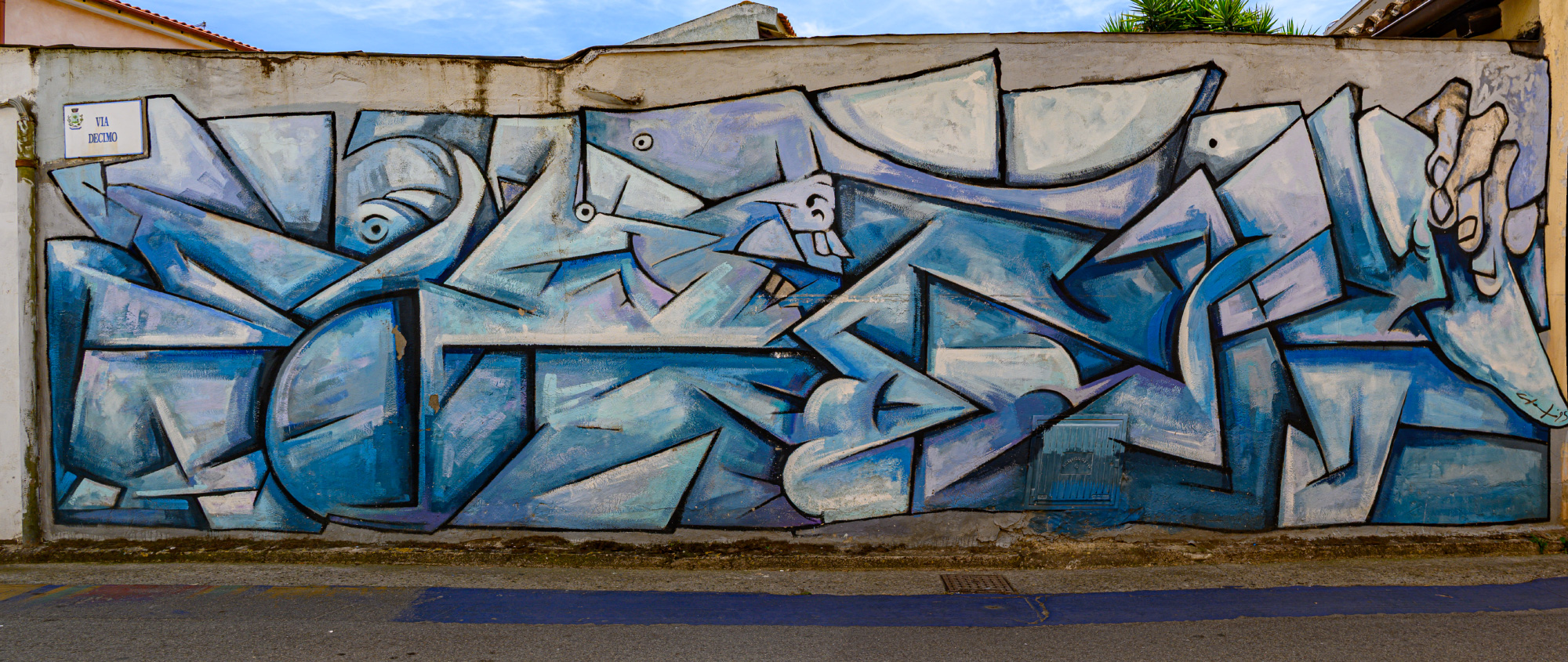 Cette table dressée et accueillante qui se trouve via Umberto est l’oeuvre d’un élève de l’Institut Rudolf Steiner de Milan, qui signe Allievi. Je pense qu’elle est peinte sur une cinquantaine de mètres au total et est l’oeuvre d’un collectif.