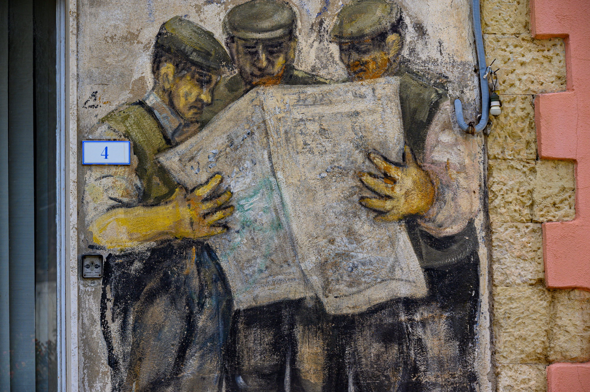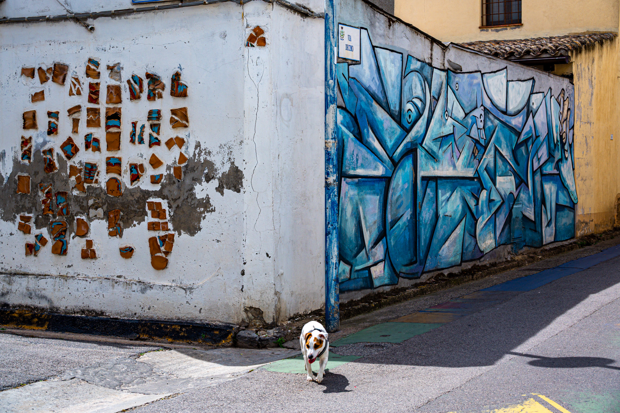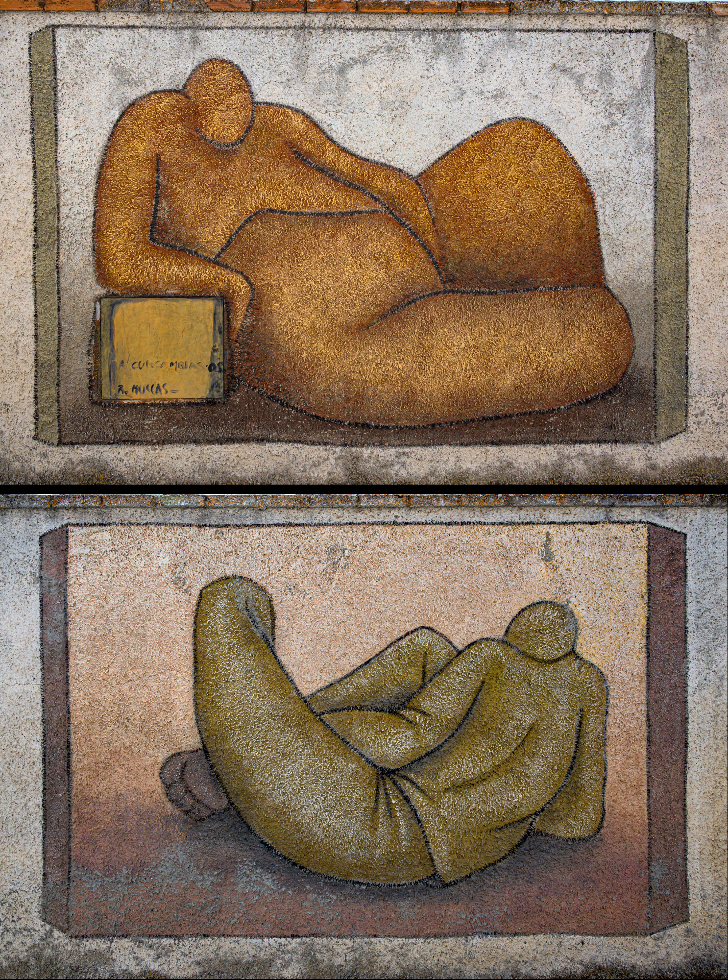 Murale de Luigi Pu 1996 avec une inscription à demie effacée : Pays d’Art Pays de Paix. Ses 7 palomas de la paix se libérant de l’écheveau complexe et tortueux du sombre monde géométrisé par les algorithmes crochus et s’envolant sur la portée musicale des rayons bleus du soleil. ( quête spirituelle ? )