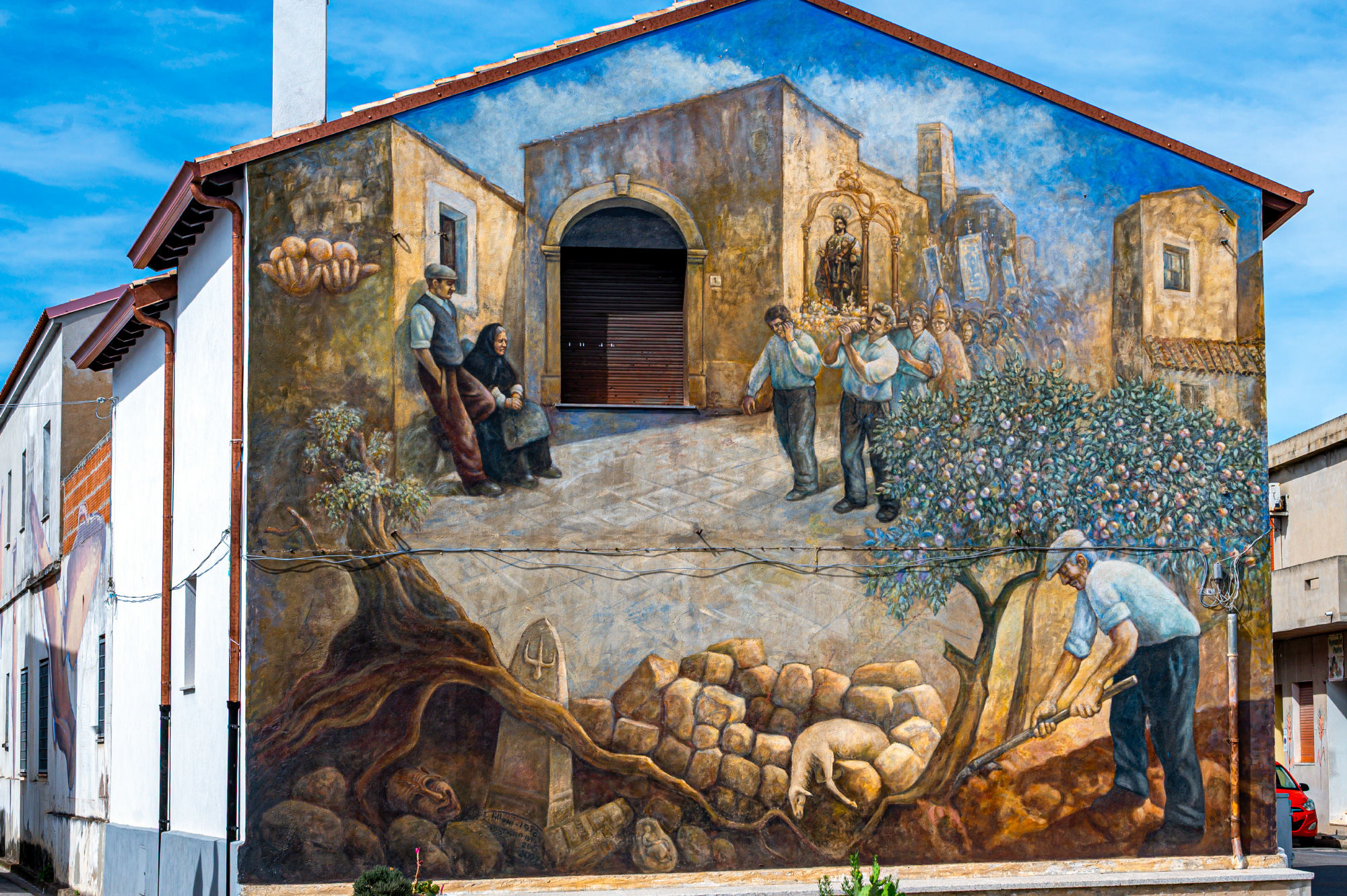 On voit le projet de cette fresque : relier le passé archéologique à la mémoire collective vivante du village comme un tout identitaire, ce que Pinuccio Sciola appelait la peau du village.