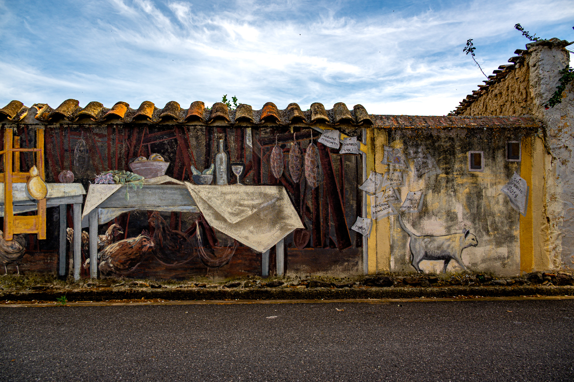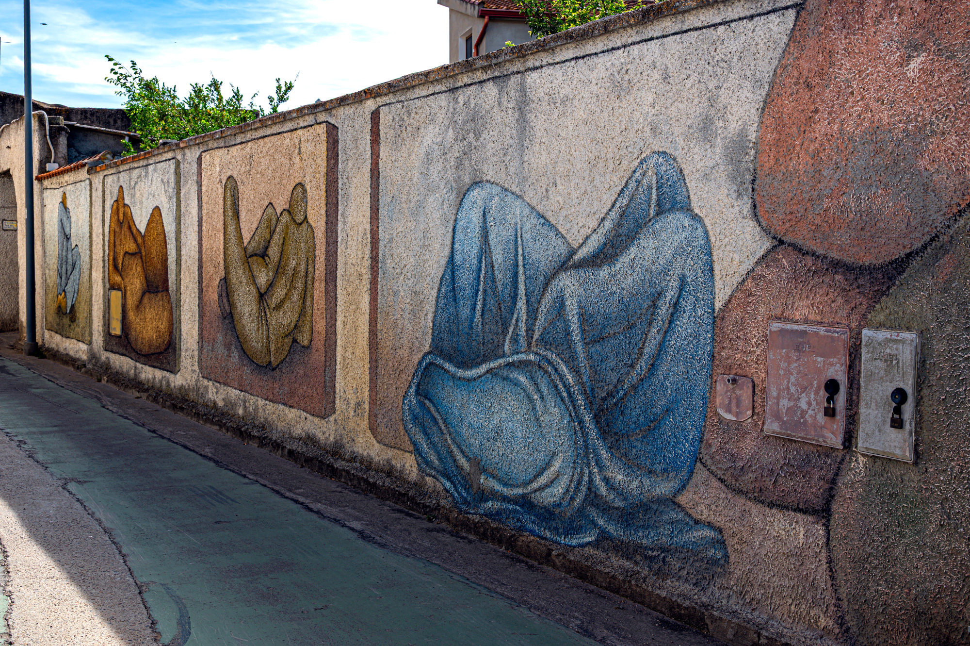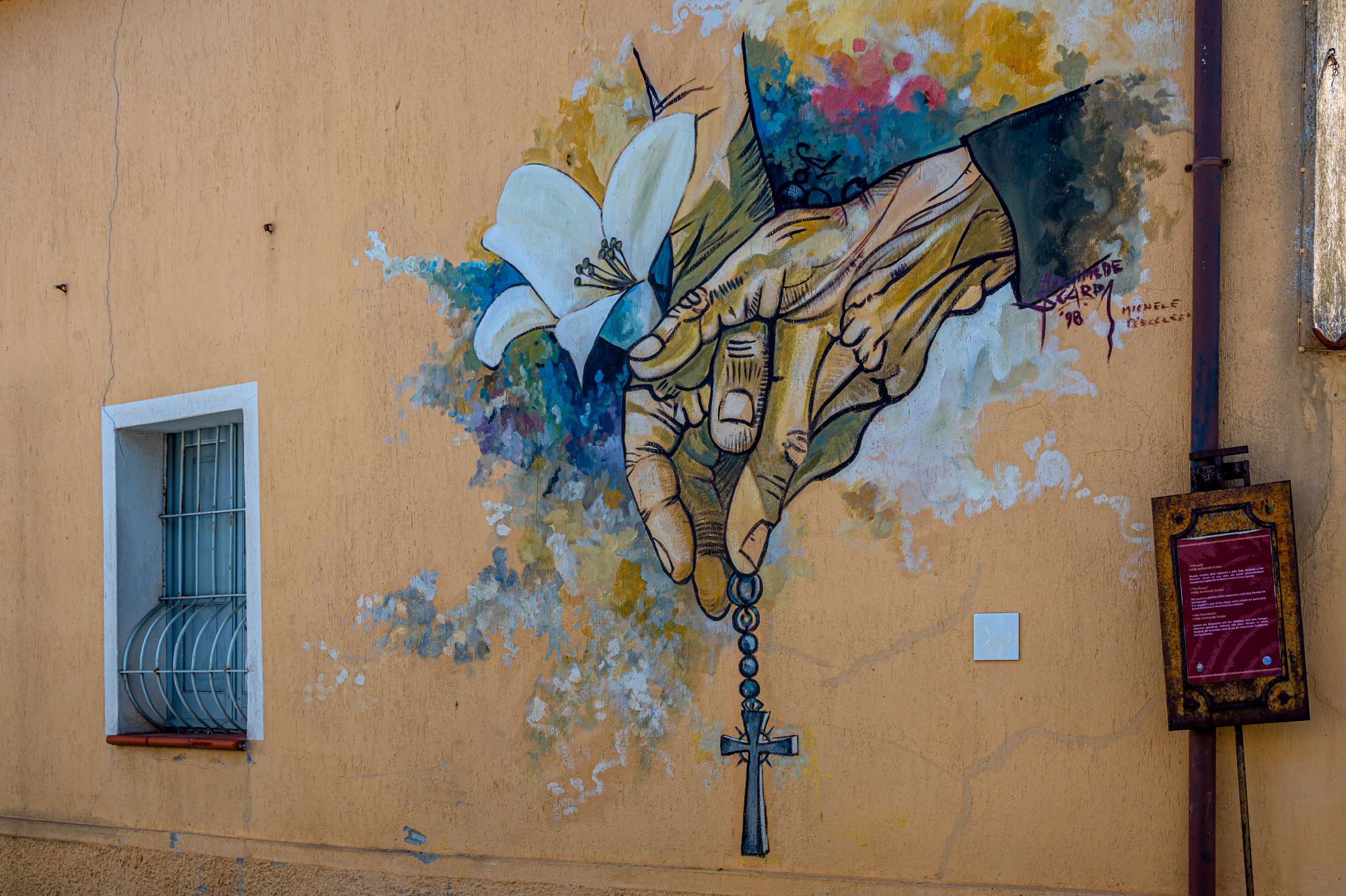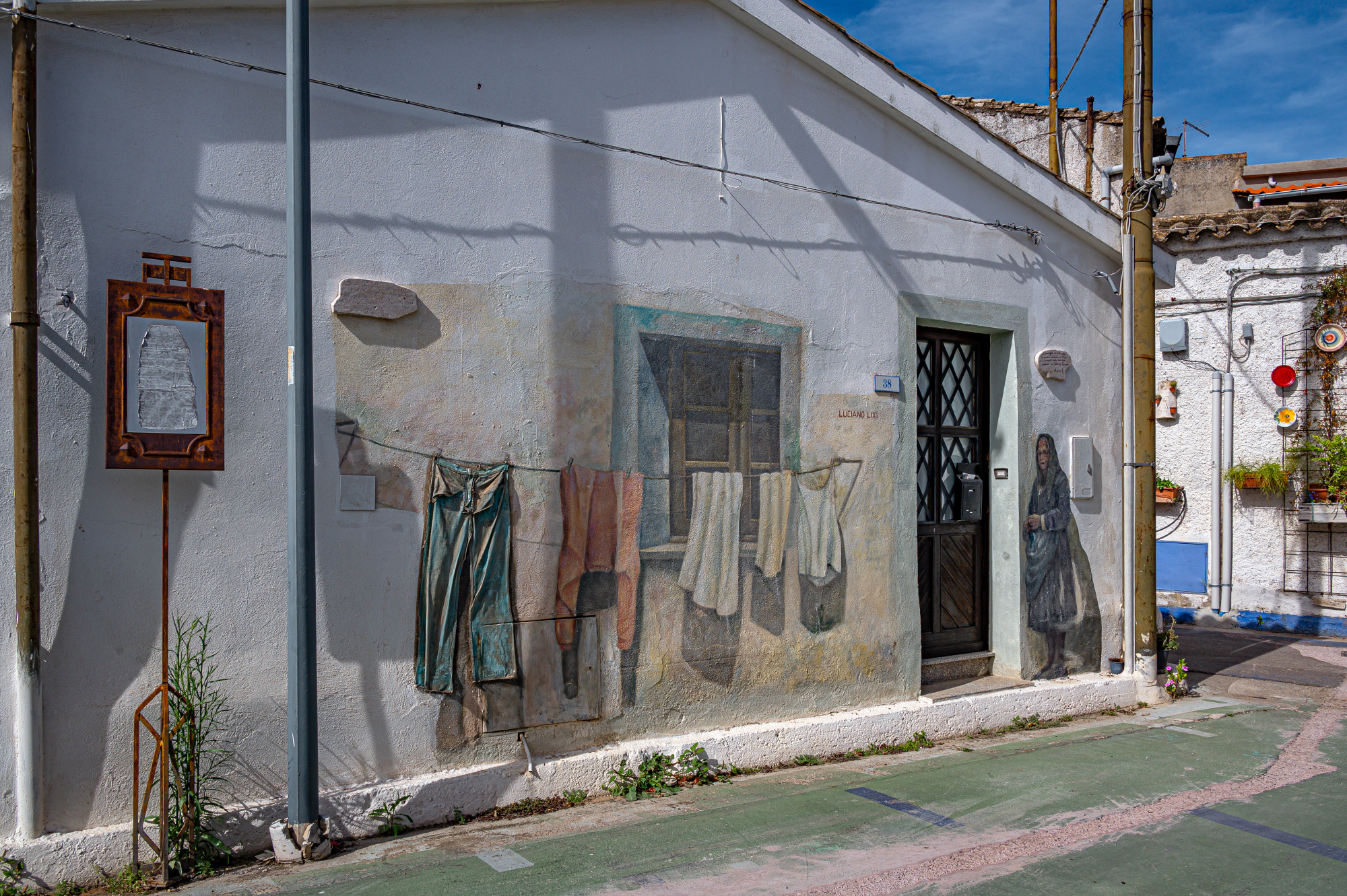 Cependant, peu à peu, d’autres fresquistes, peintres plutôt ! vinrent d’ailleurs et d’Europe joindre leur talent à l’originale entreprise. Et la variation tant en thèmes qu’en qualité, colore d’humanité simple ce paese museo et rend si agréable cette flânerie dans les rues du village qui s’enorgueillit tout de même de plus de 400 murales !