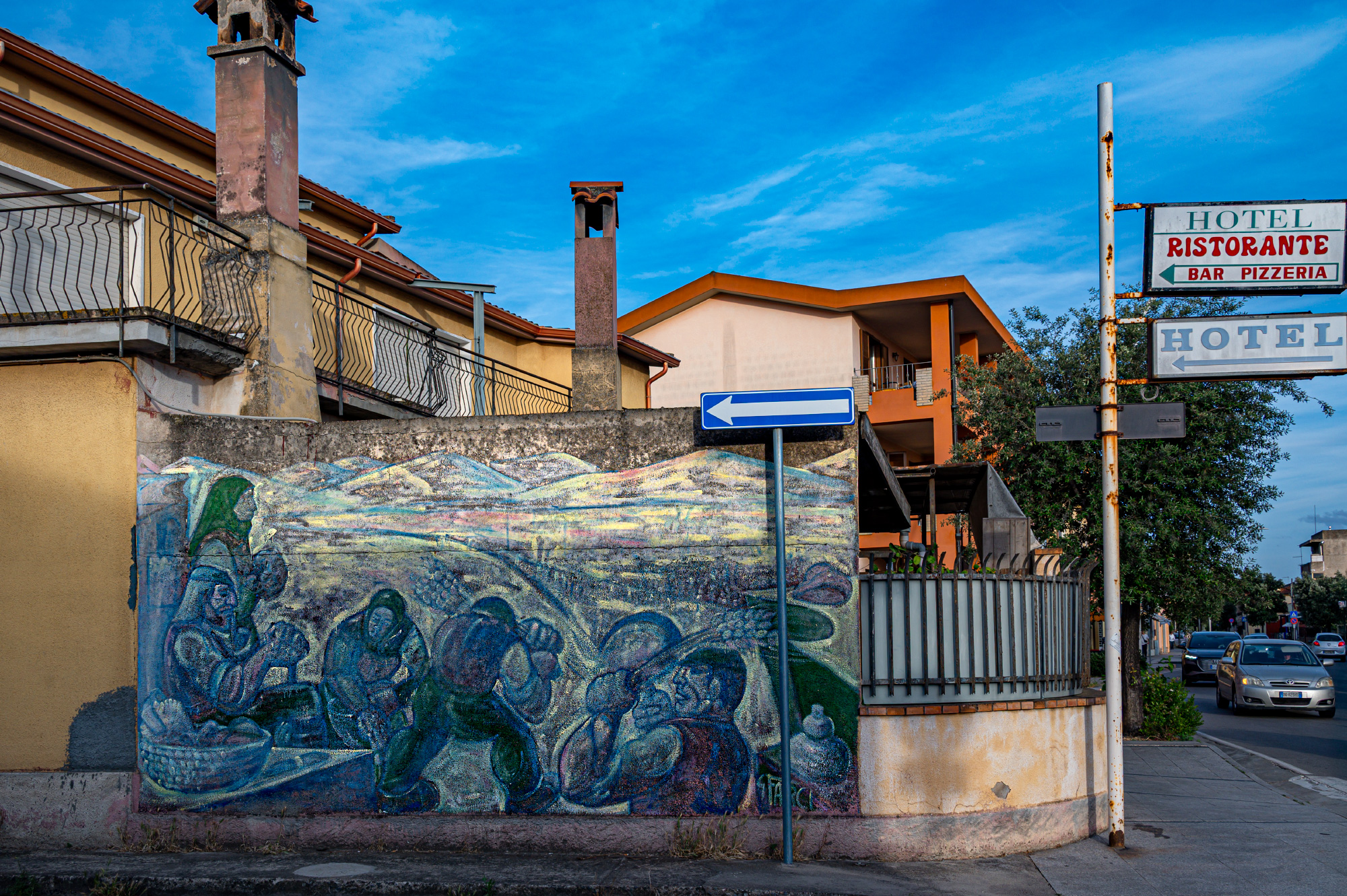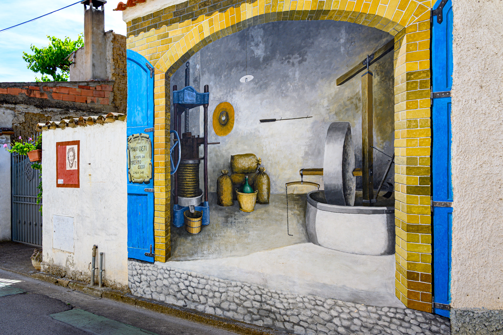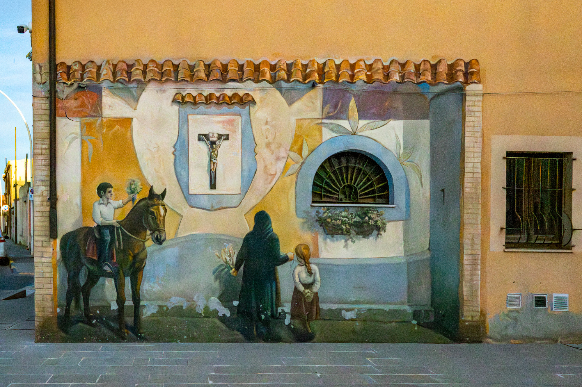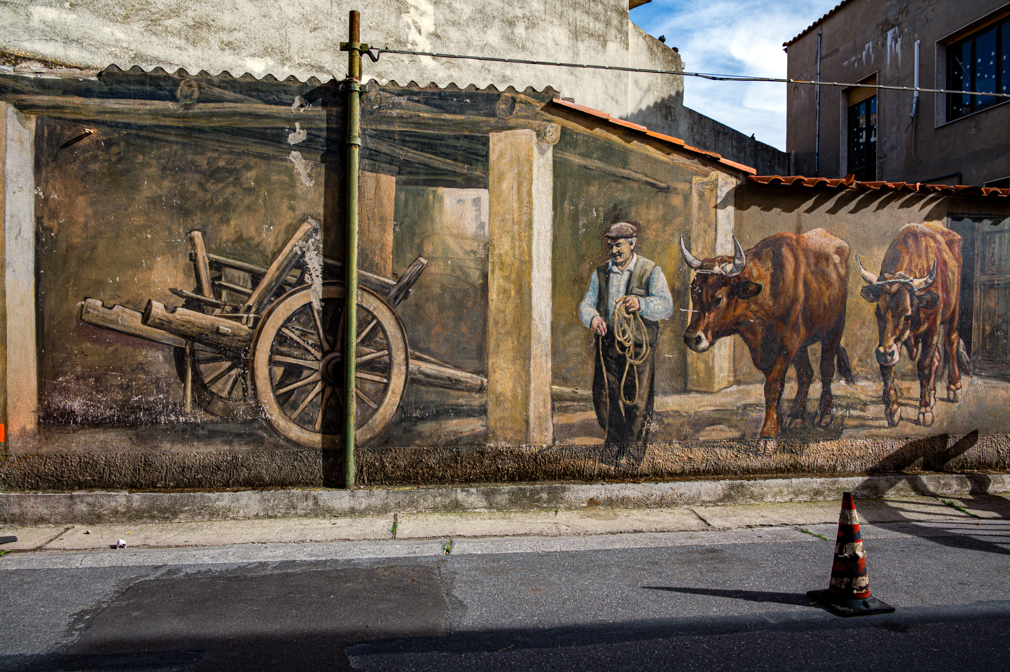 Cependant, peu à peu, d’autres fresquistes, peintres plutôt ! vinrent d’ailleurs et d’Europe joindre leur talent à l’originale entreprise. Et la variation tant en thèmes qu’en qualité, colore d’humanité simple ce paese museo et rend si agréable cette flânerie dans les rues du village qui s’enorgueillit tout de même de plus de 400 murales !
