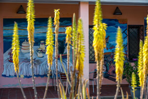 Sur l’un des murs du Hollywood Café (sic !), un Murale nous interpelle, car nous y repérons un visage désormais connu : celui de Pinuccio Sciola, maestro de San Sperate, en fait l’initiateur de tout ce courant.