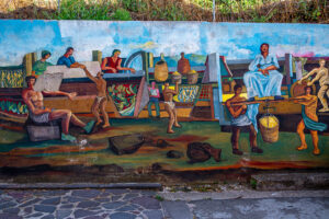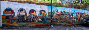En vérité le temps et la dégradation ont gommé l’ancien projet de dénonciation politique et sociale que l’on peut retrouver, par exemple via d’Itria et qui était lié au démarrage de l’activité murale à Villamar dans les années 1976 où des exilés chiliens ayant fui les persécutions de Pinochet : Alan Jofré, Uriel Parvex … s’exprimaient en couleurs vives et tranchées.