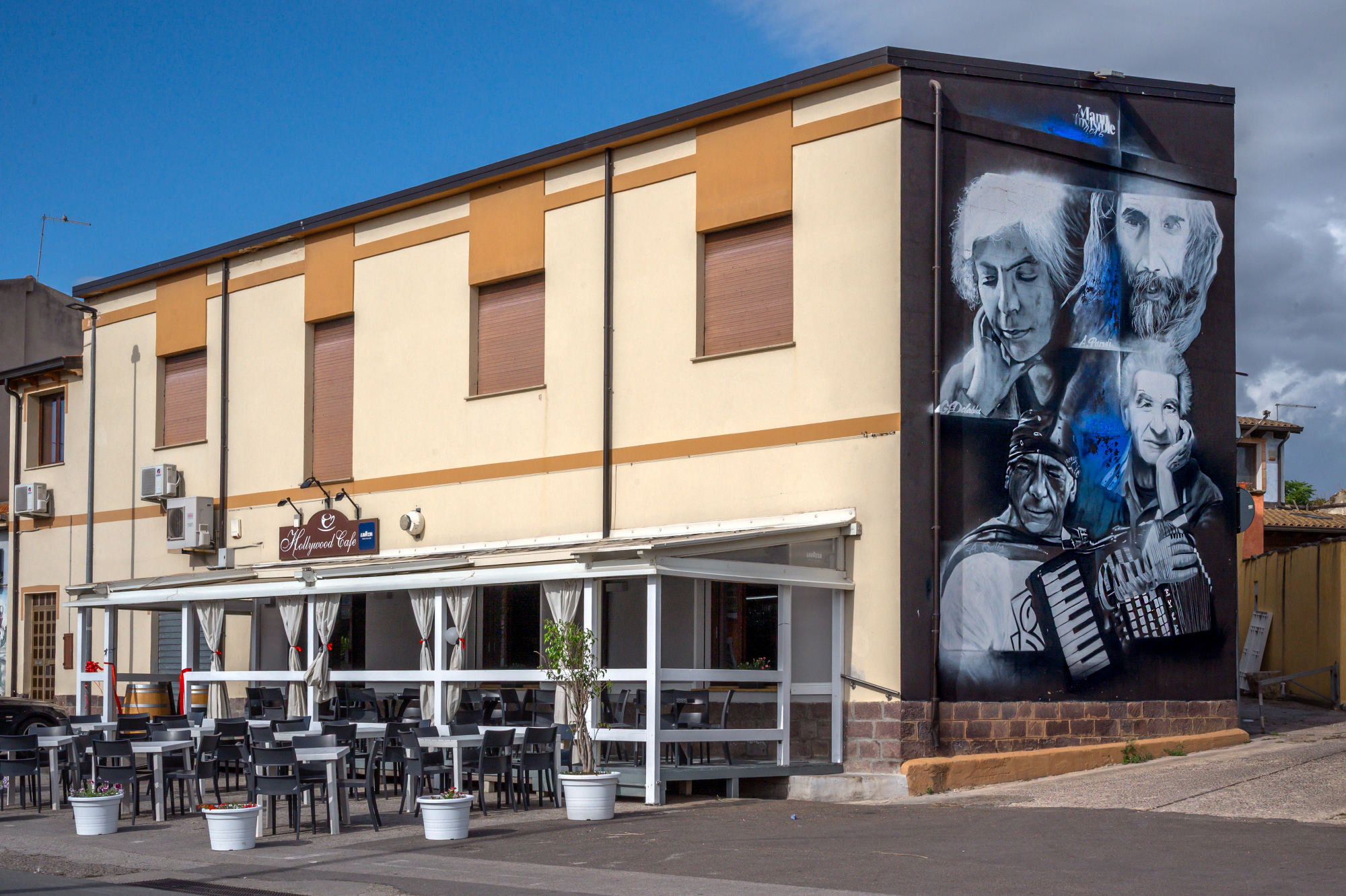 Sur l’un des murs du Hollywood Café (sic !), un Murale nous interpelle, car nous y repérons un visage désormais connu : celui de Pinuccio Sciola, maestro de San Sperate, en fait l’initiateur de tout ce courant.