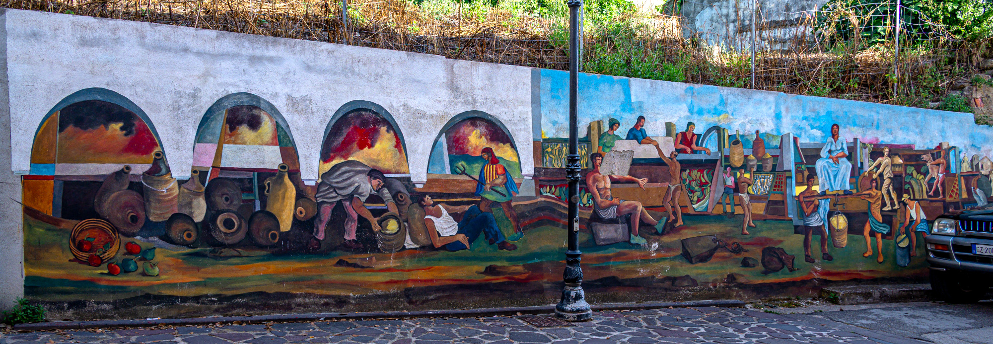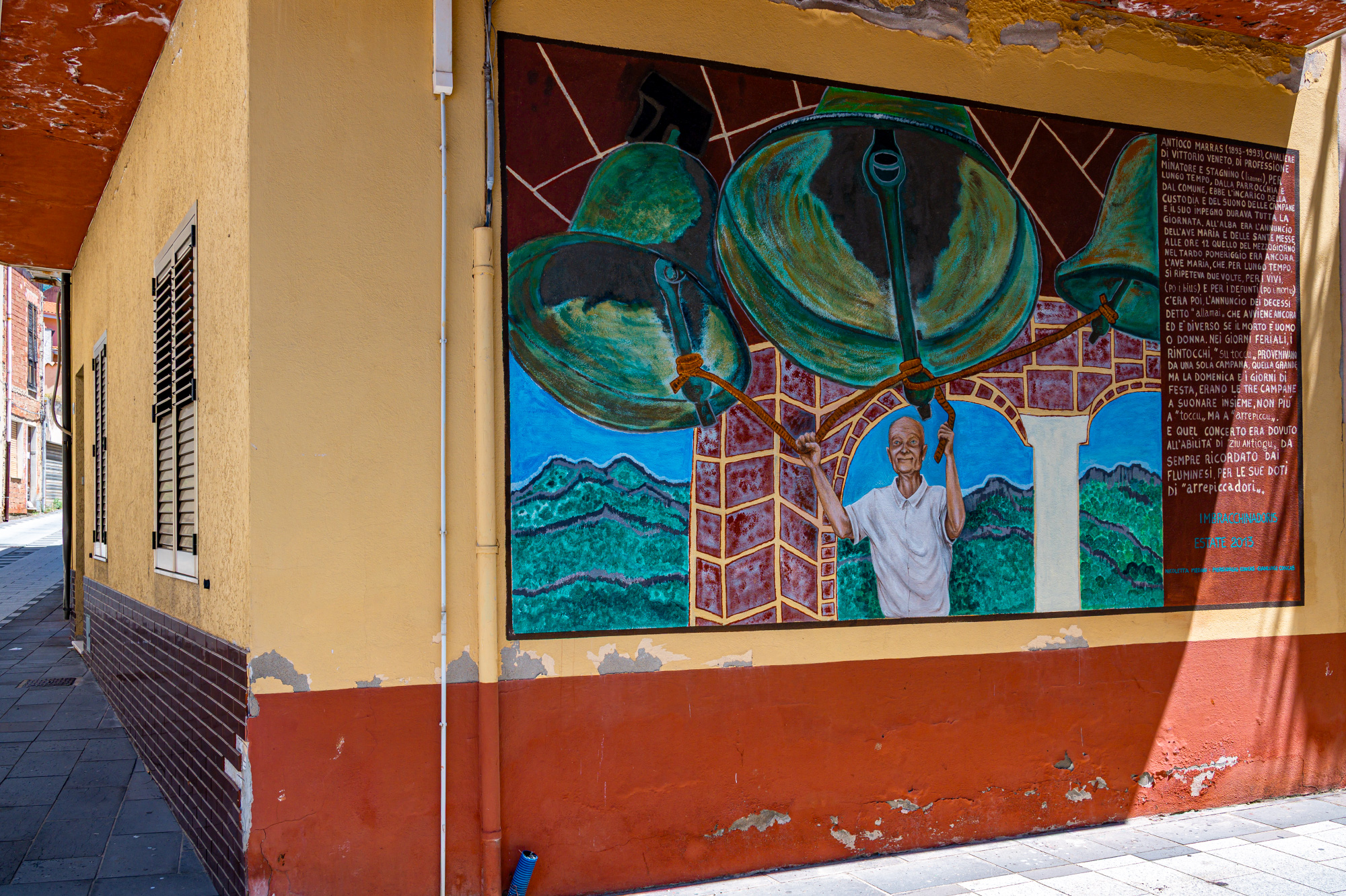 Cette peinture murale, signée Manu Invisible, 2016 célèbre 4 figures sardes importantes : Grazia Deledda, prix Nobel de Littérature en 1926, Andrea Parodi, voix emblématique de la chanson sarde, Antonello Salis, né ici, à Villamar, grand accordéoniste et compositeur de Jazz et … Pinuccio Sciola, dont la renommée, en réalité est due à ses «pierres sonores», vues précédemment.
