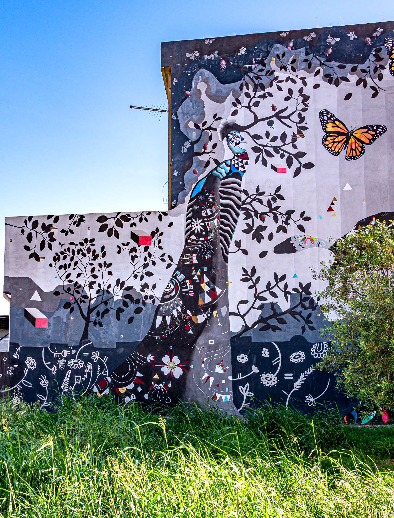 Nous garons notre Caracol sur une grande place de stationnement entourée de fresques et de sculptures. De multiples Murales nous environnent.