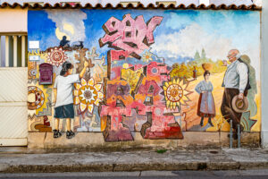 La fresque ci-dessous, plus récente (Ikur 2019 ) introduit une dimension assez peu présente dans les réalisations murales de San Sperate : elle est au service d’une Cause, étrangère au village, en dénonçant l’assassinat par le MOSSAD en 1972 d’un écrivain et militant politique palestinien, Ghassan Kanafani.
