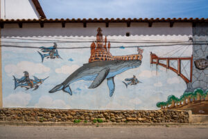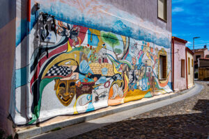 A gauche, en basquets, la casquette à l’envers, un jeune graffeur est en train de bomber des formes abstraites sur un mur. A droite, en contraste, un vieil homme d’une autre génération, de profil, en gilet sur chemise blanche, chapeau à la main et chaussures de ville, regarde ce jeune en pleine « expression artistique » (?) tout en désignant de sa main droite, en arrière plan, une femme Sarde en tenue traditionnelle, sur fond de campagne ensoleillée qui porte sur sa tête une corbeille d’osier tressé. Au centre, entre les 2 scènes, le nom de la ville est écrit à la manière de cet art bien particulier des graffitis qui exaltent le lettrage (parfois/souvent jusqu’à la nausée).