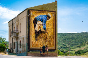 Tout a commencé ici, dans ce petit village modeste et ignoré, qui nous avait hébergé une nuit sur son aire. Voilà qu’en repartant on découvre cette étonnante peinture sur une maison isolée sur fond de campagne.