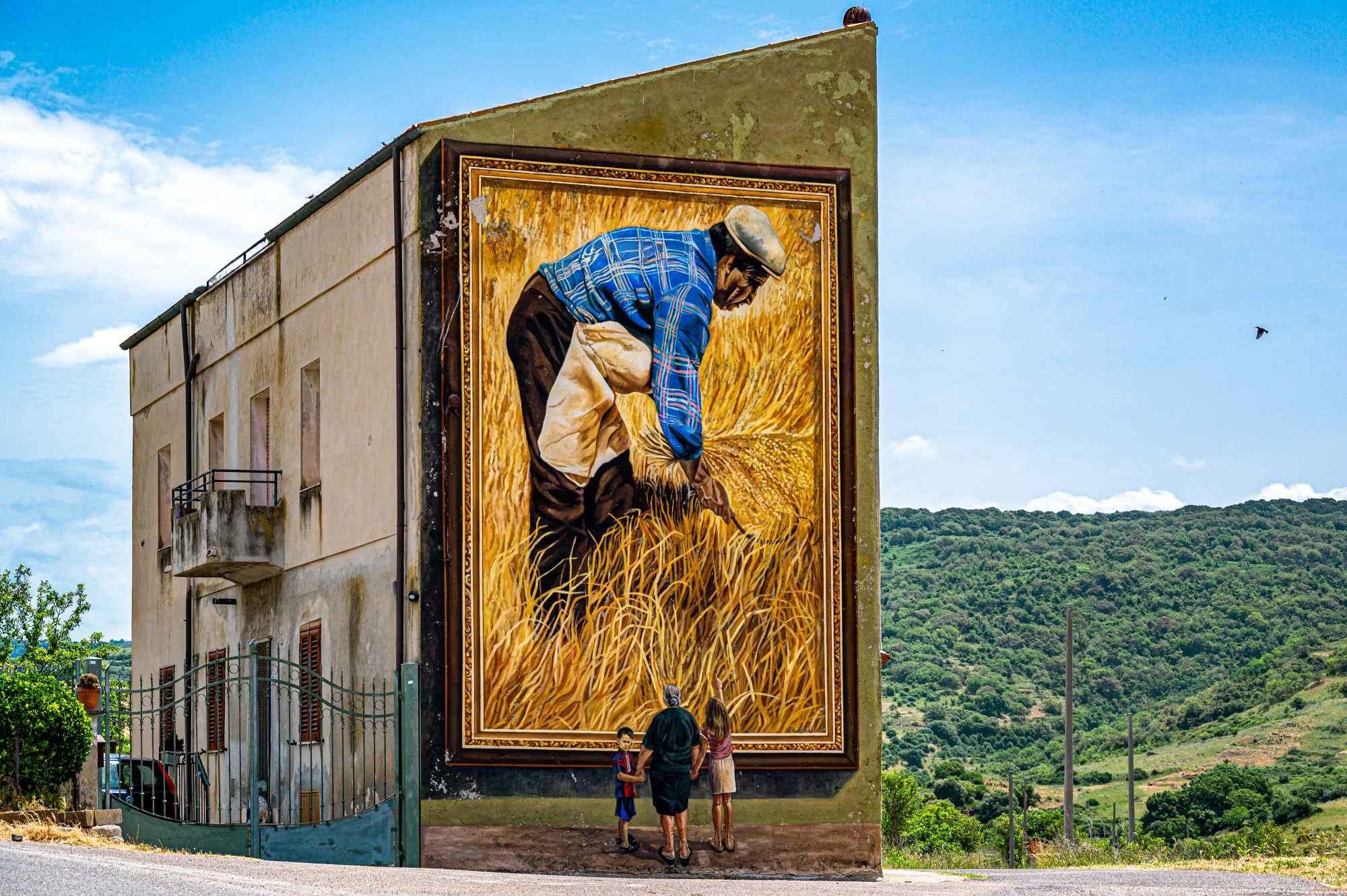 Tout a commencé ici, dans ce petit village modeste et ignoré, qui nous avait hébergé une nuit sur son aire. Voilà qu’en repartant on découvre cette étonnante peinture sur une maison isolée sur fond de campagne.