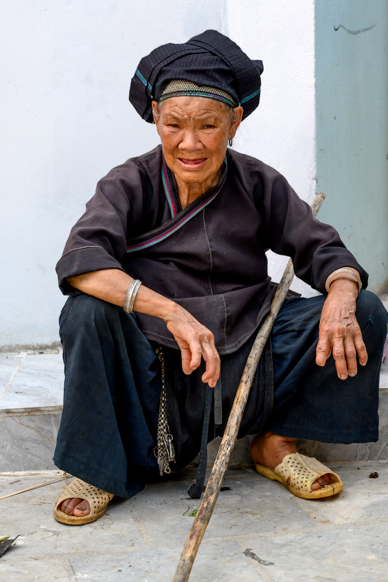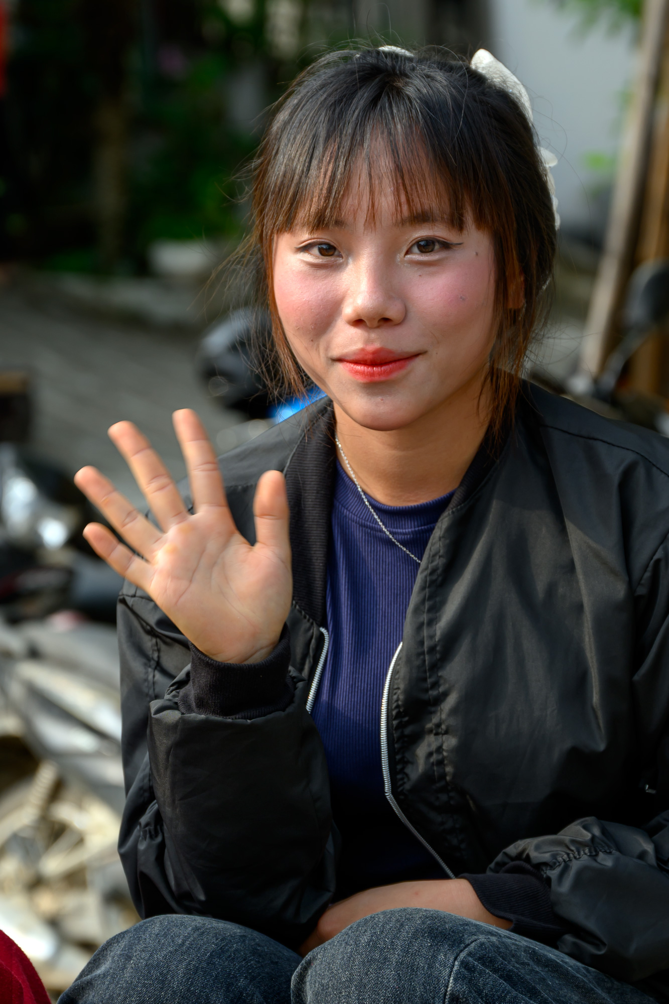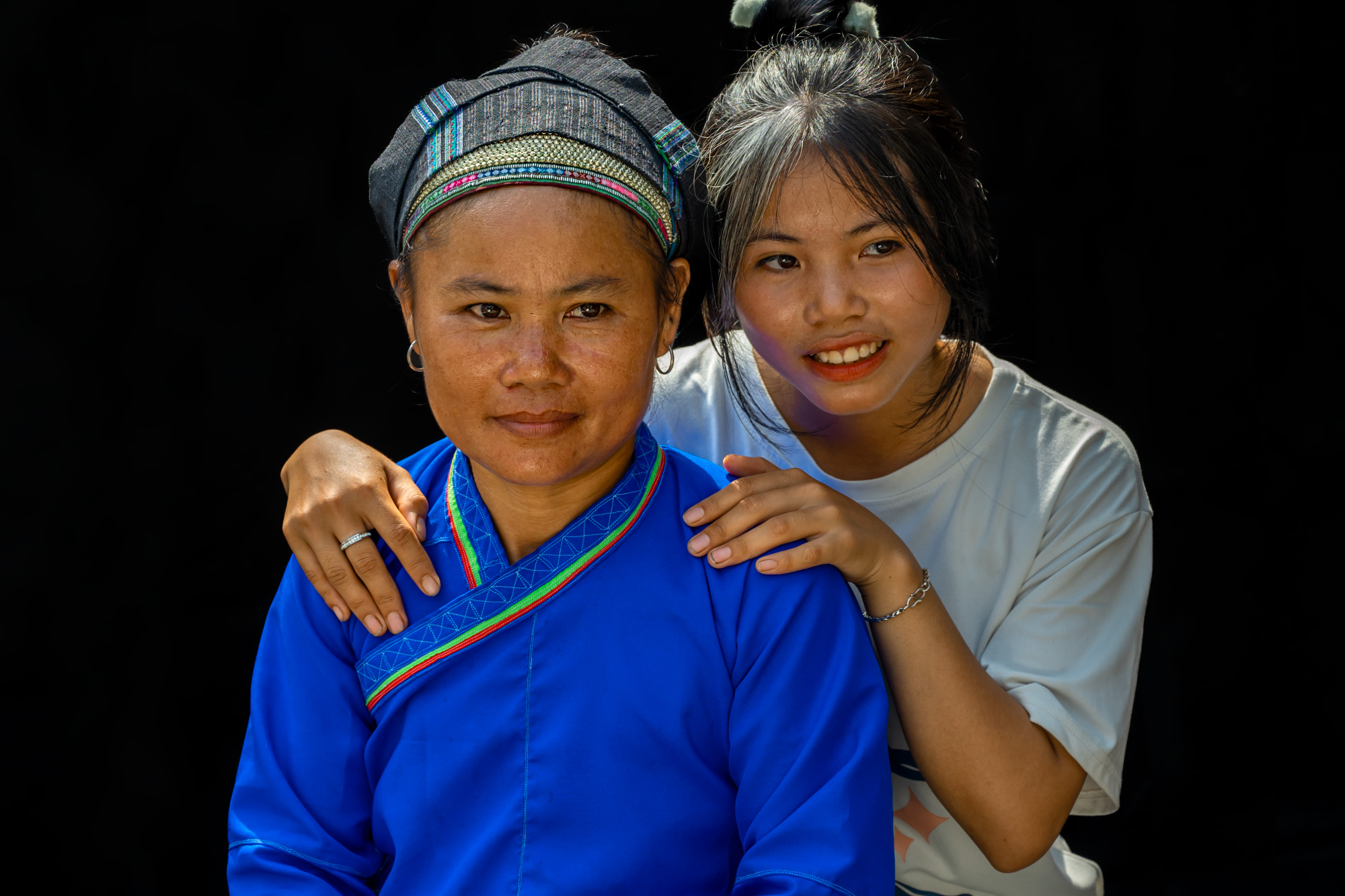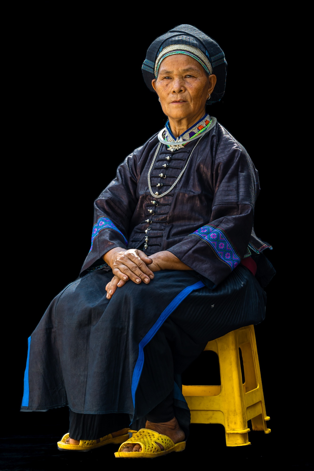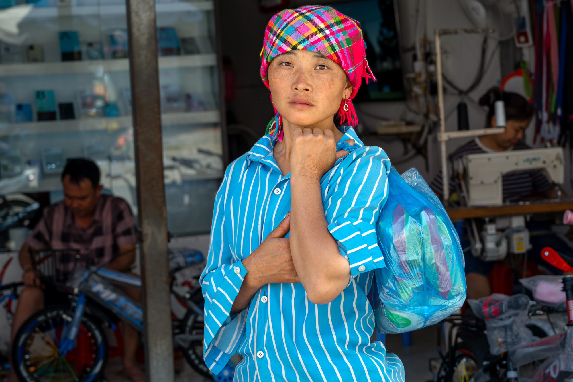4- À ajouter un élément surprenant et intéressant. Dans le village de Xin Man, le jour du marché traditionnel une séance de studio photo élémentaire est réalisée en extérieur sur la terrasse d’un bar, en plein marché. Avec un dispositif simplifié mais efficace : un fond noir et un réflecteur lastolit, la lumière naturelle du soleil arrivant légèrement par derrière. Certes certes, mais… les modèles ??? Et bien c’est Thui qui se charge d’aller convaincre les passantes de venir poser un instant (la prise de vue dure quelques minutes). Et avec quel argument incitatif ??? Celui de repartir avec un tirage photo de 13×18 réalisé sur le champ avec une petite imprimante Canon. Et ??? Et ça marche !!! Incroyable ! Quand je vous parlais de bienveillance extraordinaire ! Ce qui n’enlève rien à la capacité de persuasion de Thui.🤪 Bien sûr certain(e) ont refusé mais à ce que j’ai vu, c’était plus pour des raisons de « programme personnel » : elle avait terminé le marché, tenait à bout de bras, des sacs et des sacs de marchandises et une poule et… était pressée de rentrer chez elle.