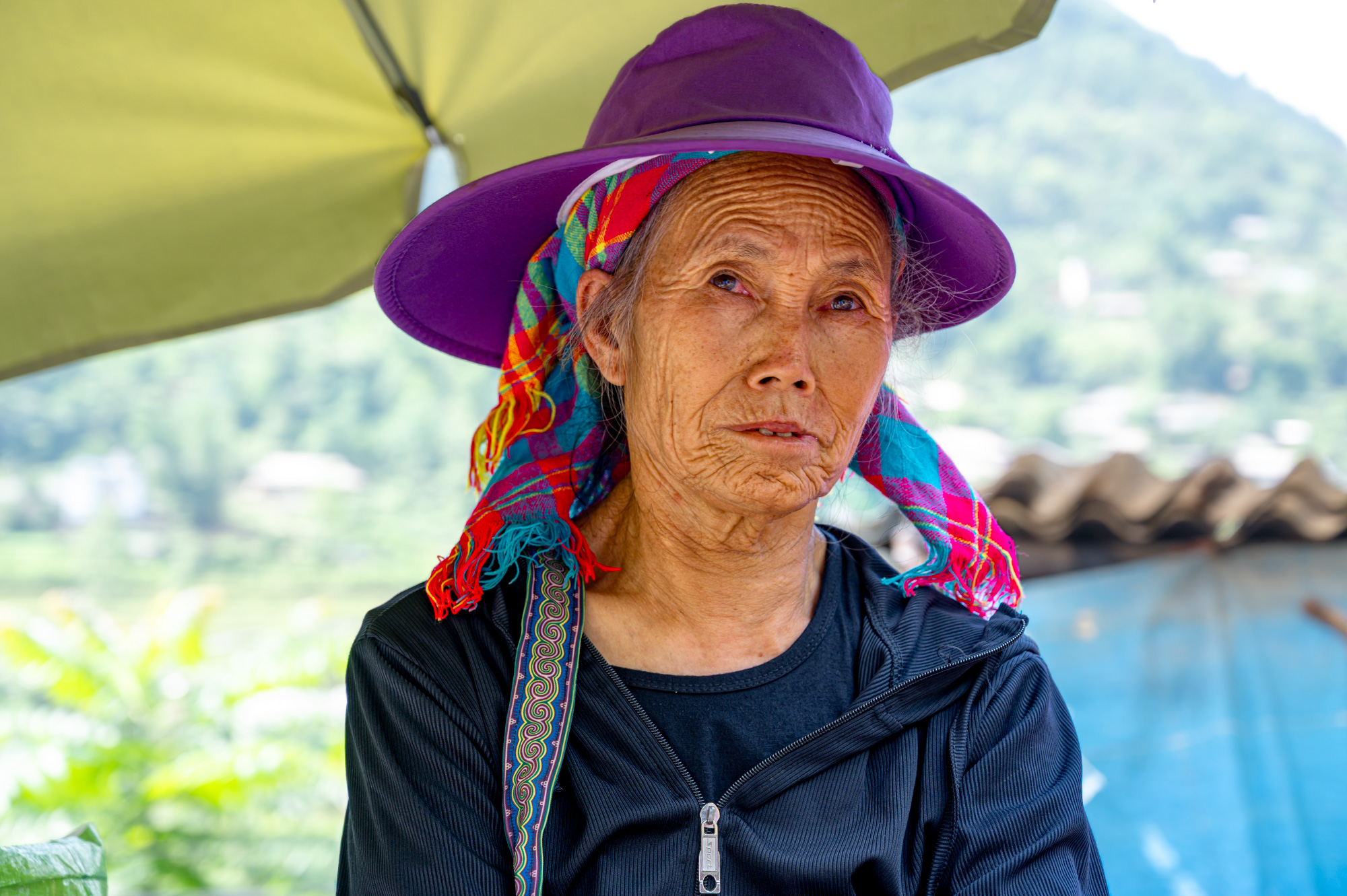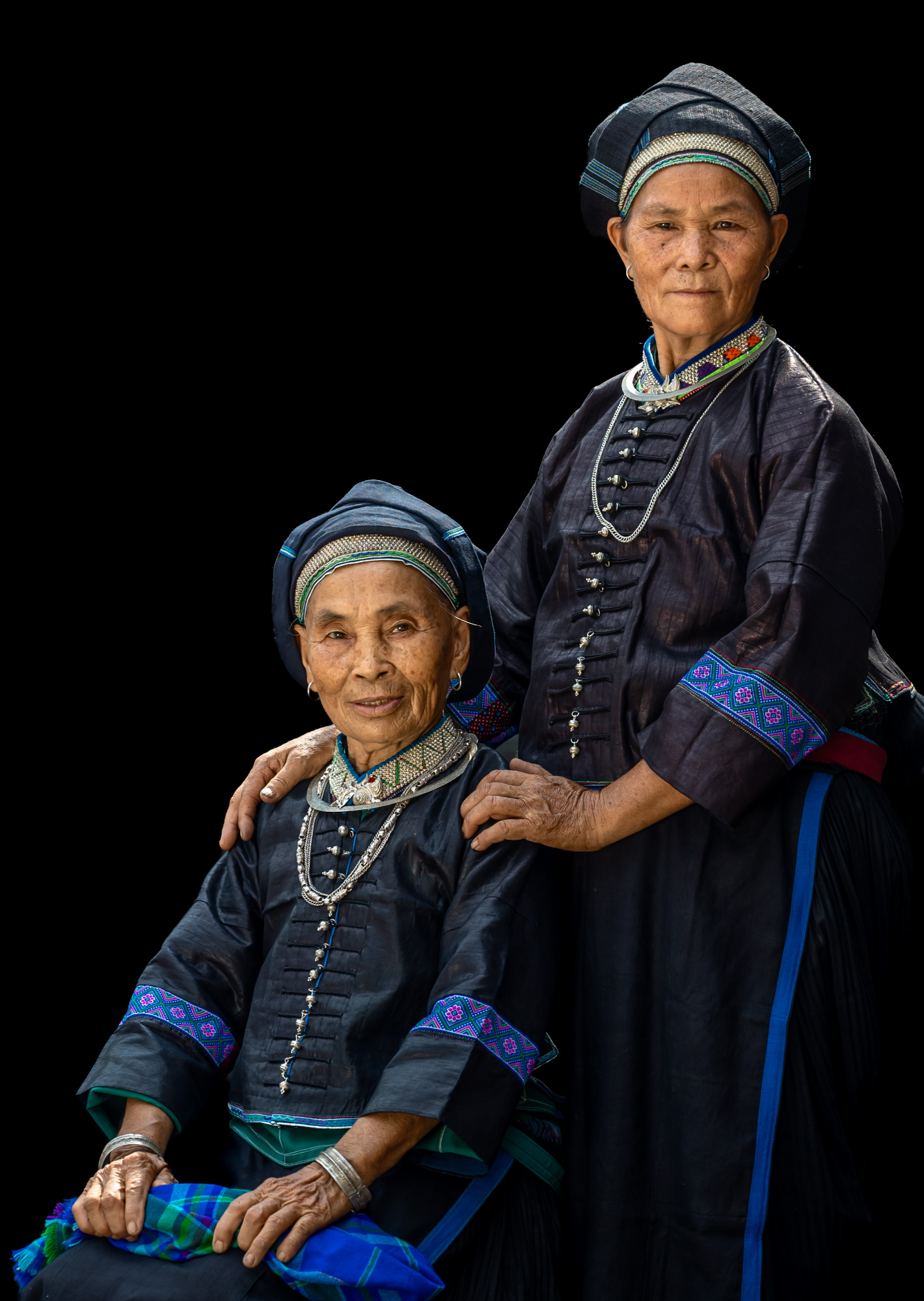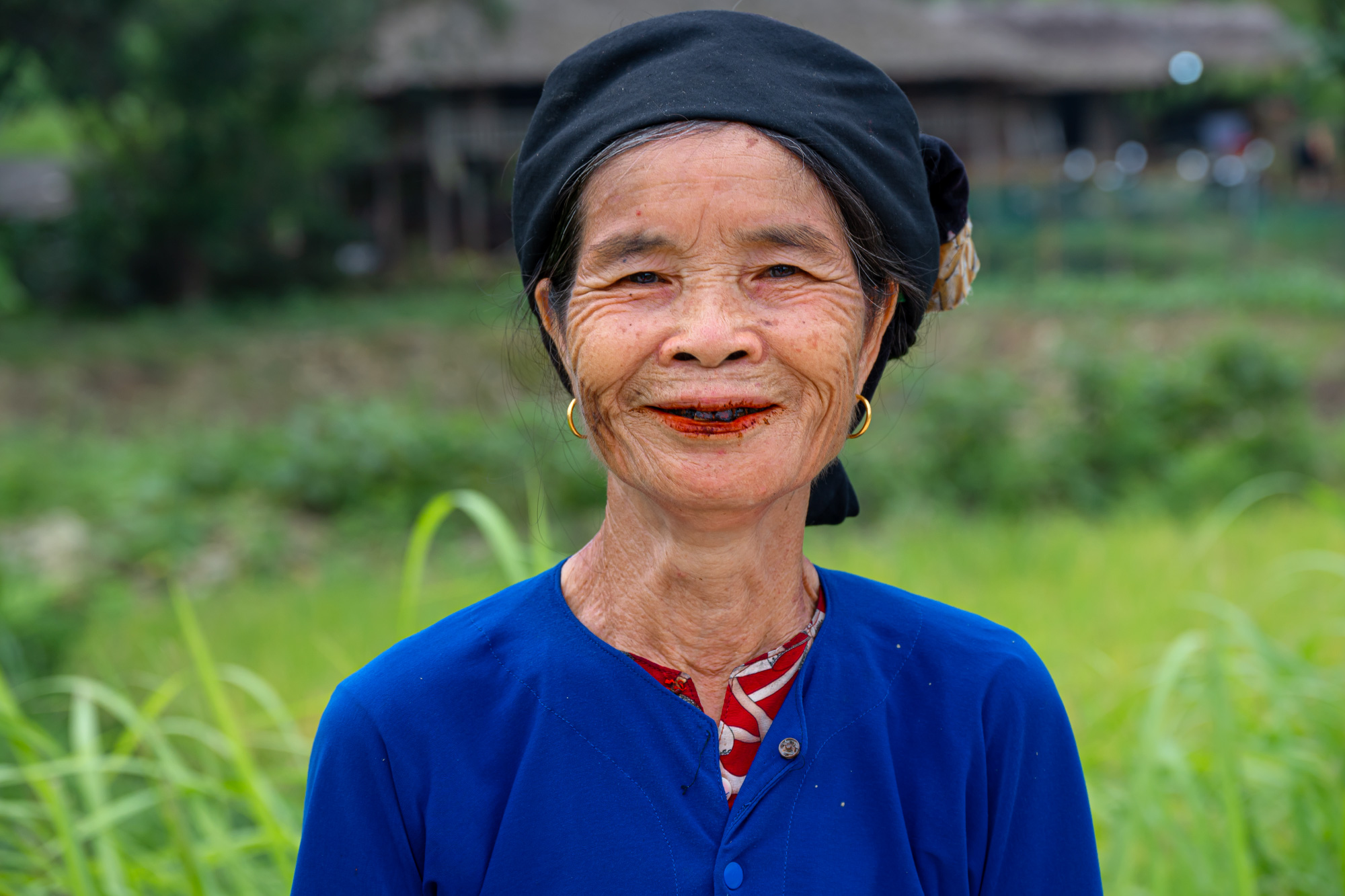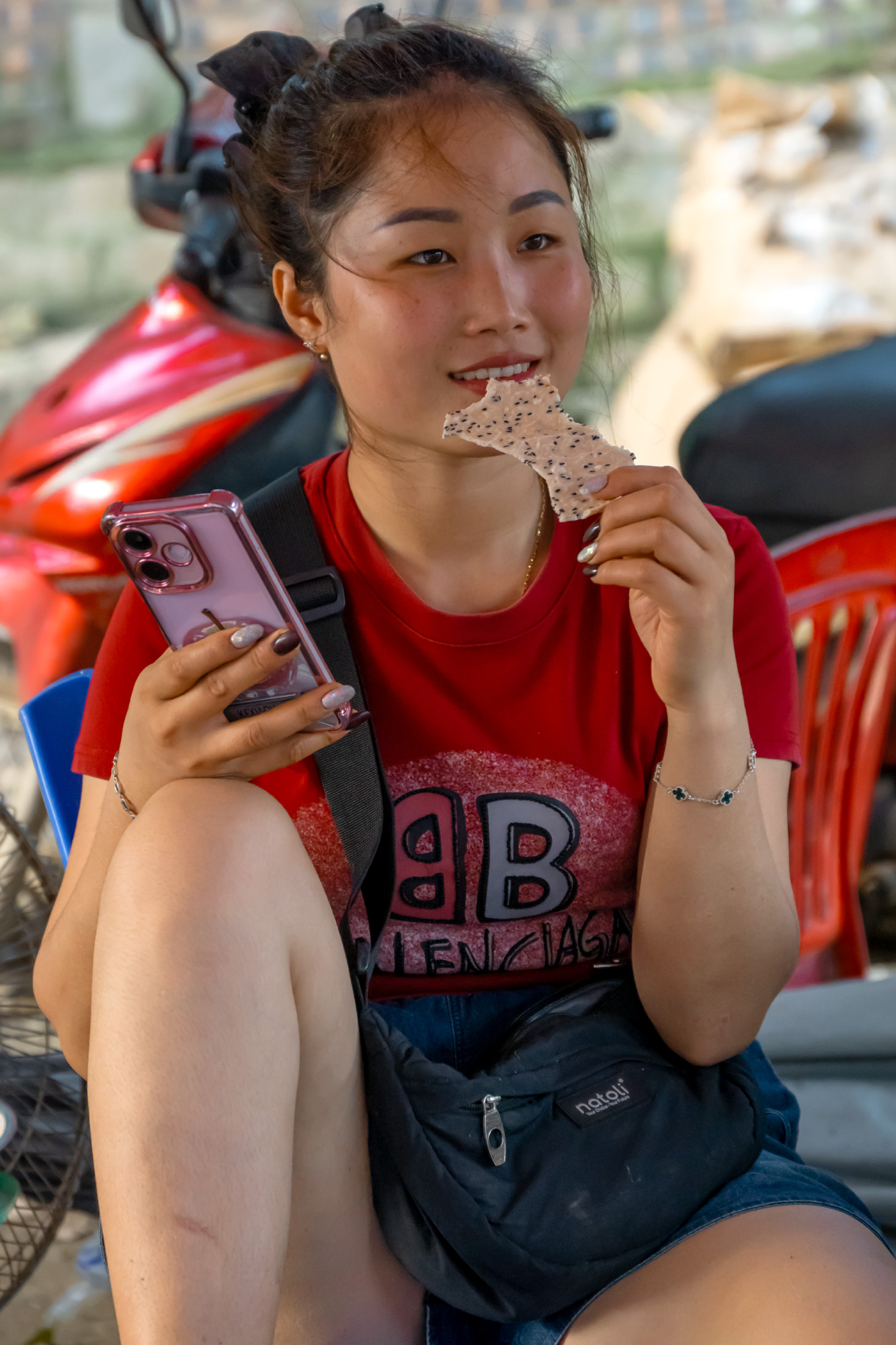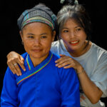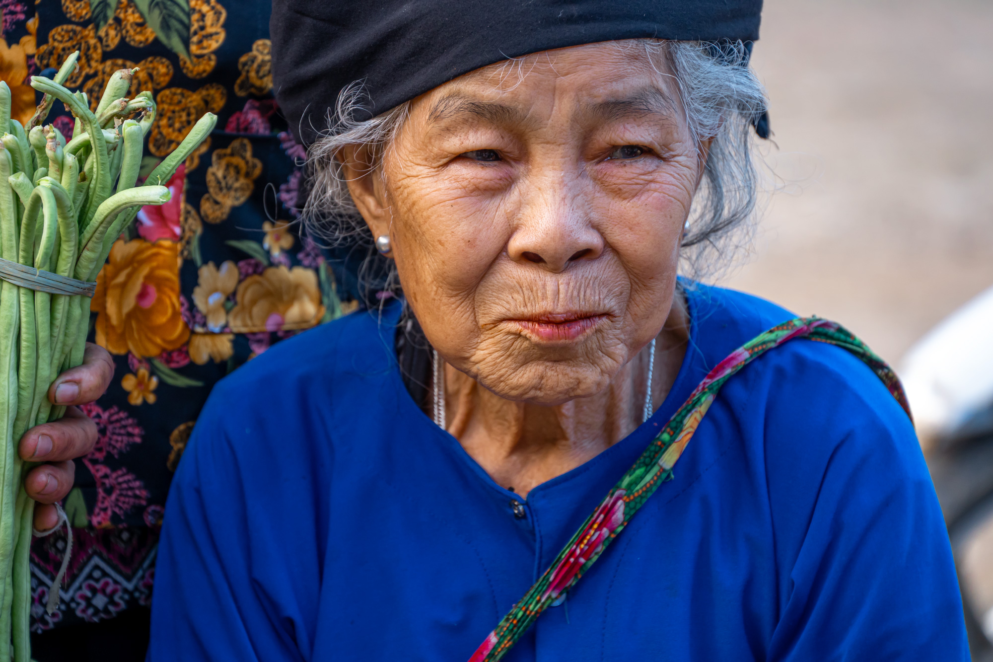 4- À ajouter un élément surprenant et intéressant. Dans le village de Xin Man, le jour du marché traditionnel une séance de studio photo élémentaire est réalisée en extérieur sur la terrasse d’un bar, en plein marché. Avec un dispositif simplifié mais efficace : un fond noir et un réflecteur lastolit, la lumière naturelle du soleil arrivant légèrement par derrière. Certes certes, mais… les modèles ??? Et bien c’est Thui qui se charge d’aller convaincre les passantes de venir poser un instant (la prise de vue dure quelques minutes). Et avec quel argument incitatif ??? Celui de repartir avec un tirage photo de 13×18 réalisé sur le champ avec une petite imprimante Canon. Et ??? Et ça marche !!! Incroyable ! Quand je vous parlais de bienveillance extraordinaire ! Ce qui n’enlève rien à la capacité de persuasion de Thui.🤪 Bien sûr certain(e) ont refusé mais à ce que j’ai vu, c’était plus pour des raisons de « programme personnel » : elle avait terminé le marché, tenait à bout de bras, des sacs et des sacs de marchandises et une poule et… était pressée de rentrer chez elle.