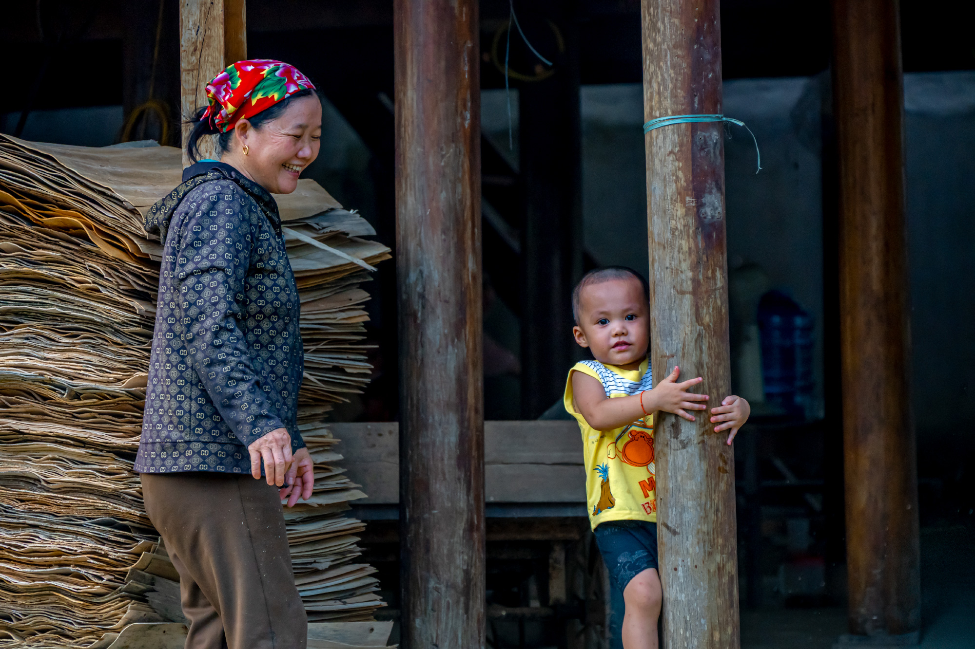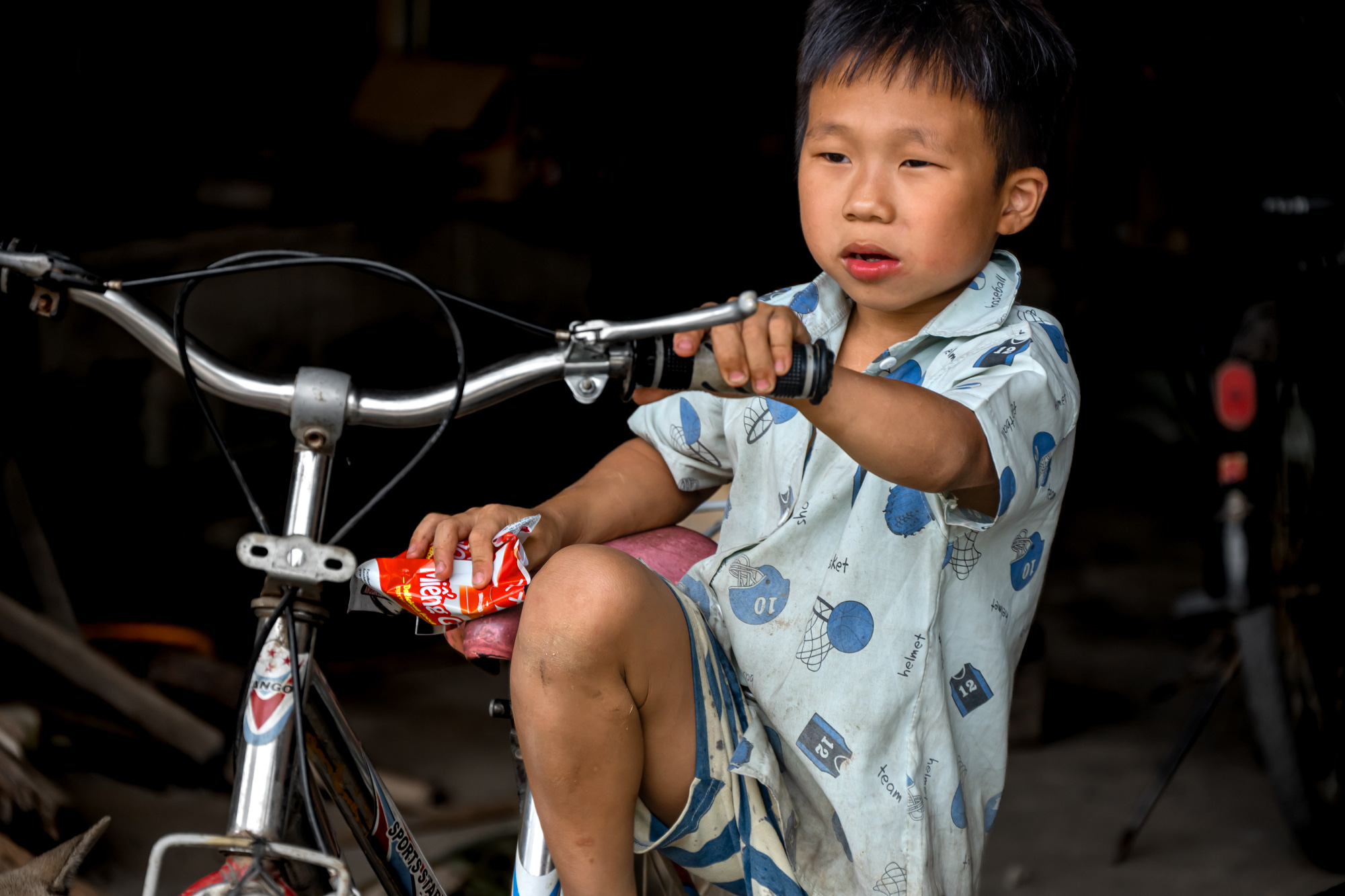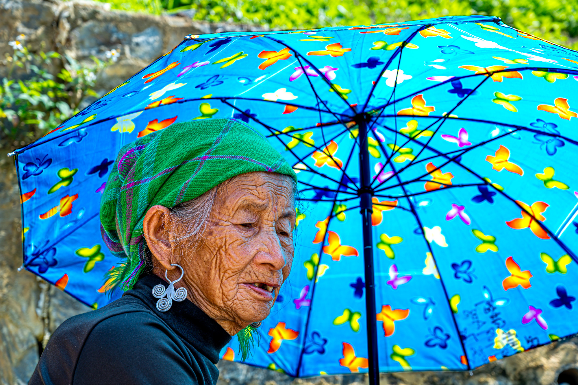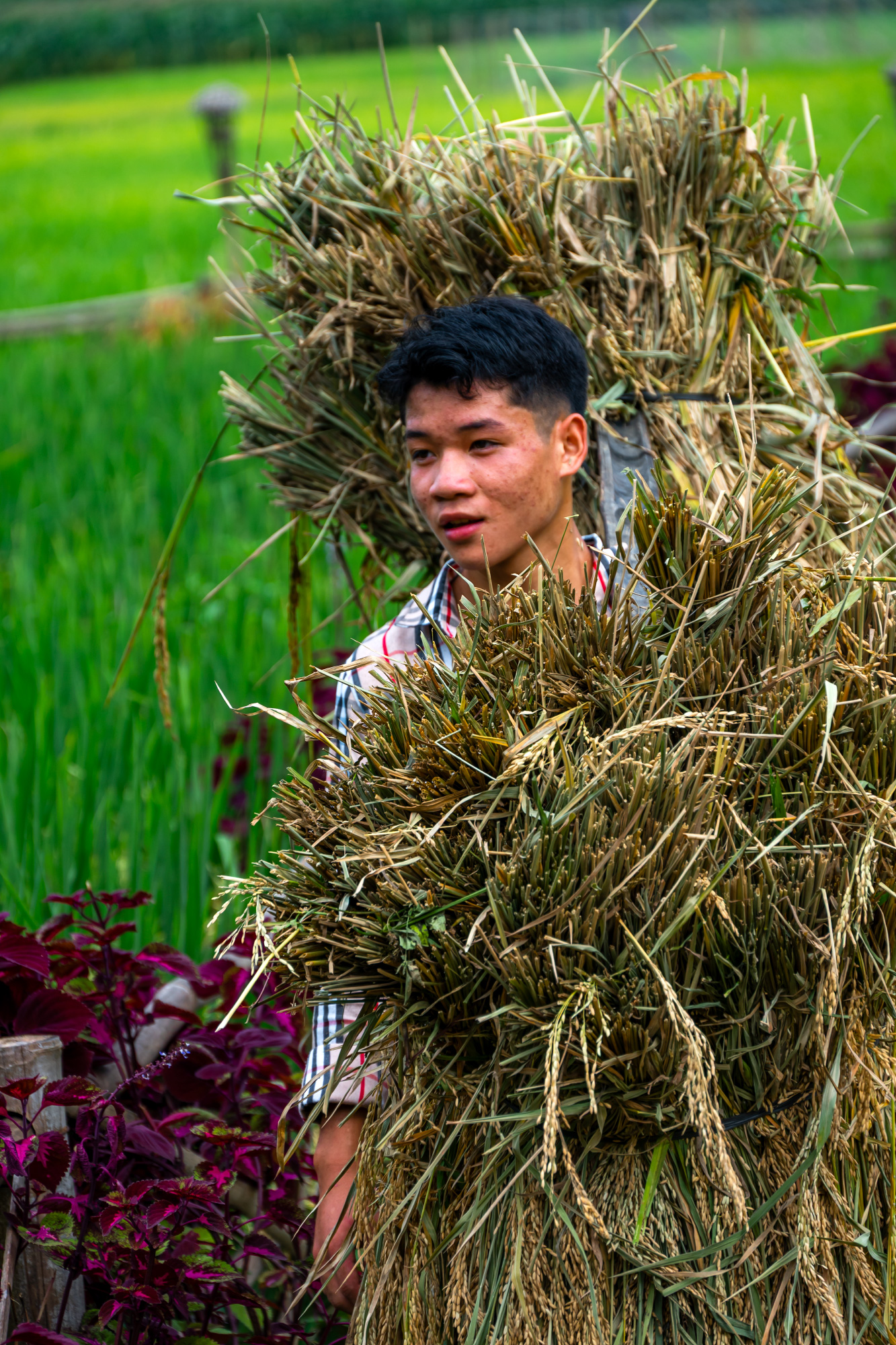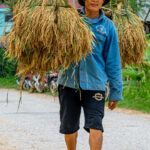 4- À ajouter un élément surprenant et intéressant. Dans le village de Xin Man, le jour du marché traditionnel une séance de studio photo élémentaire est réalisée en extérieur sur la terrasse d’un bar, en plein marché. Avec un dispositif simplifié mais efficace : un fond noir et un réflecteur lastolit, la lumière naturelle du soleil arrivant légèrement par derrière. Certes certes, mais… les modèles ??? Et bien c’est Thui qui se charge d’aller convaincre les passantes de venir poser un instant (la prise de vue dure quelques minutes). Et avec quel argument incitatif ??? Celui de repartir avec un tirage photo de 13×18 réalisé sur le champ avec une petite imprimante Canon. Et ??? Et ça marche !!! Incroyable ! Quand je vous parlais de bienveillance extraordinaire ! Ce qui n’enlève rien à la capacité de persuasion de Thui.🤪 Bien sûr certain(e) ont refusé mais à ce que j’ai vu, c’était plus pour des raisons de « programme personnel » : elle avait terminé le marché, tenait à bout de bras, des sacs et des sacs de marchandises et une poule et… était pressée de rentrer chez elle.