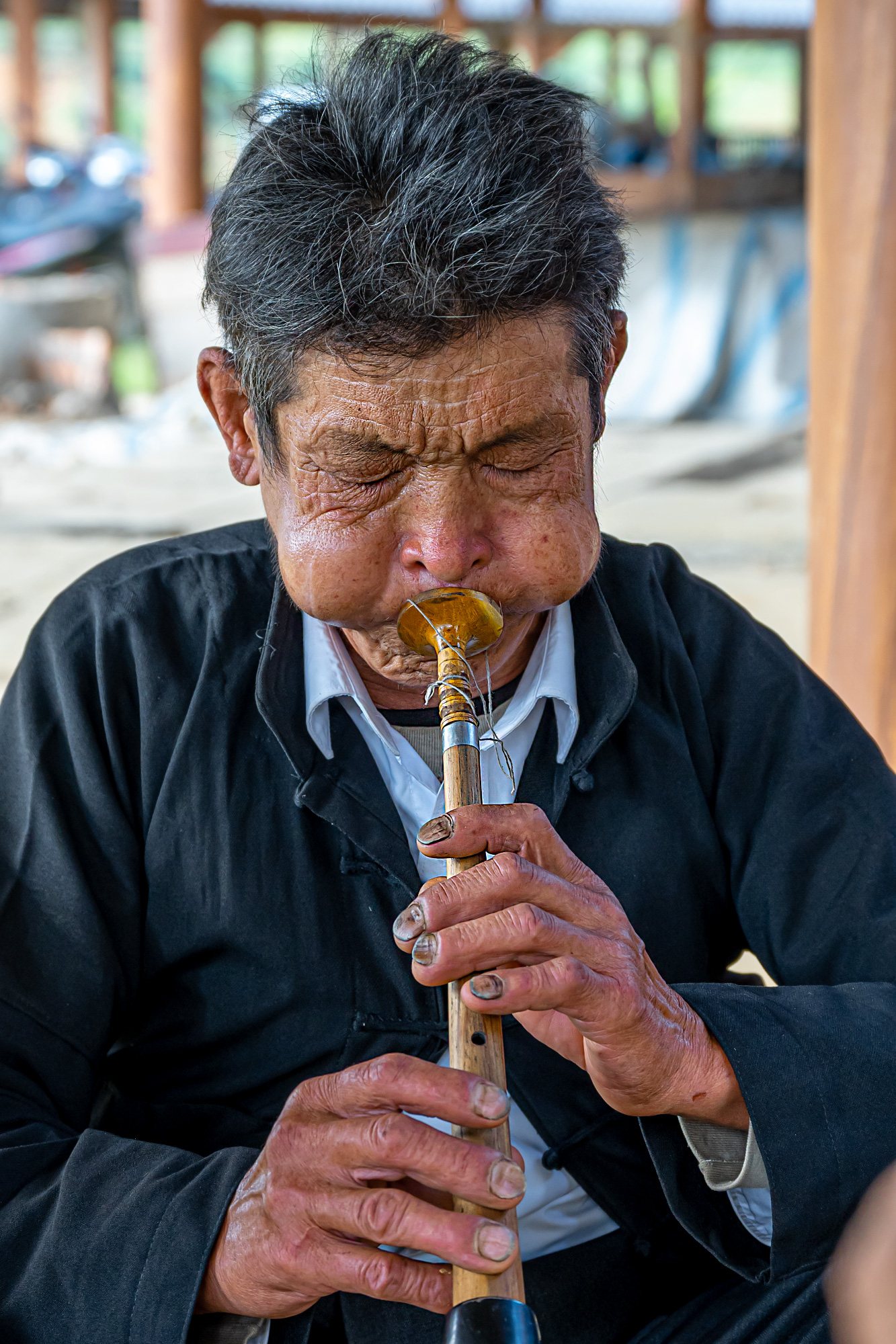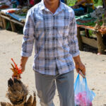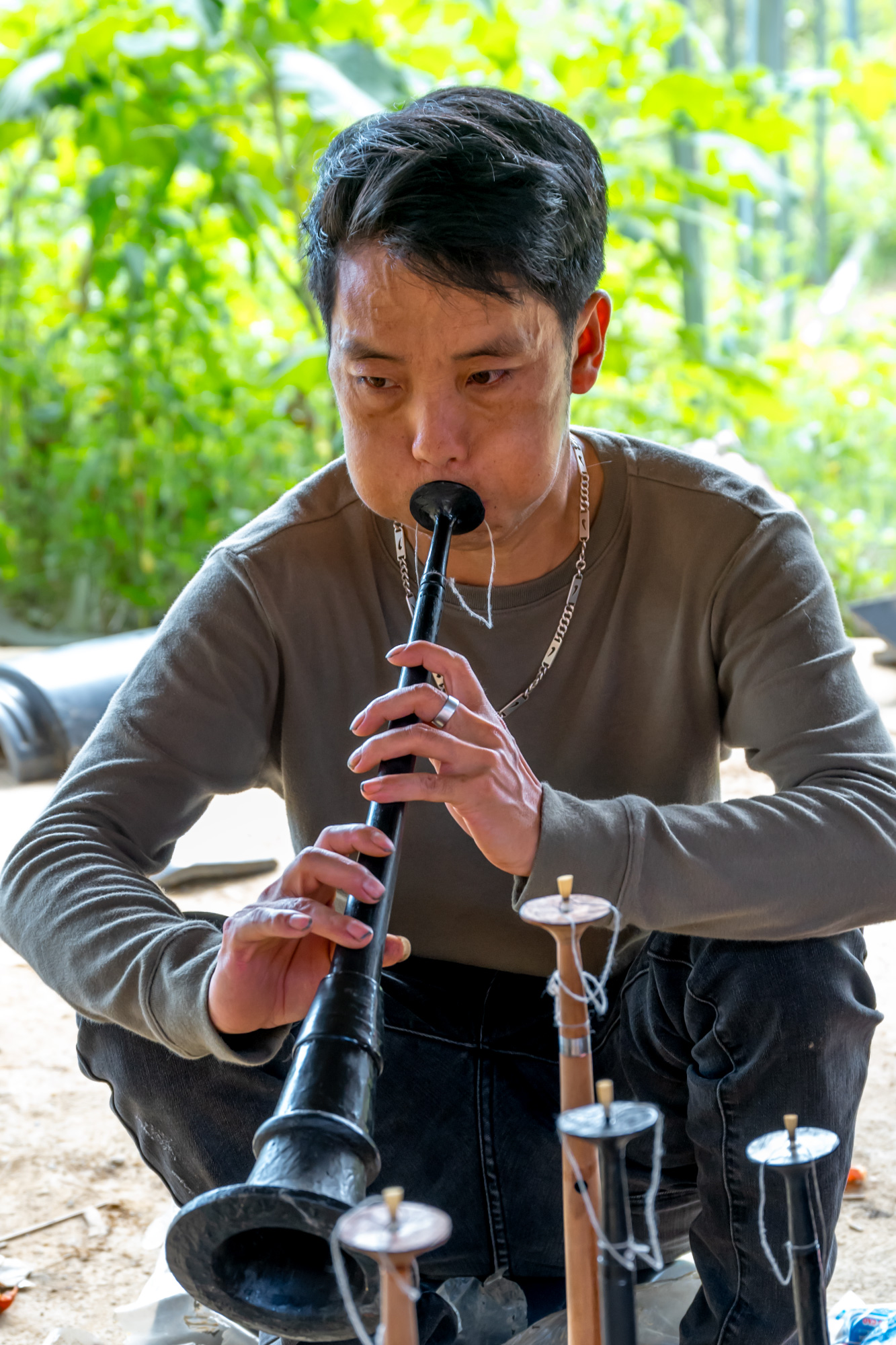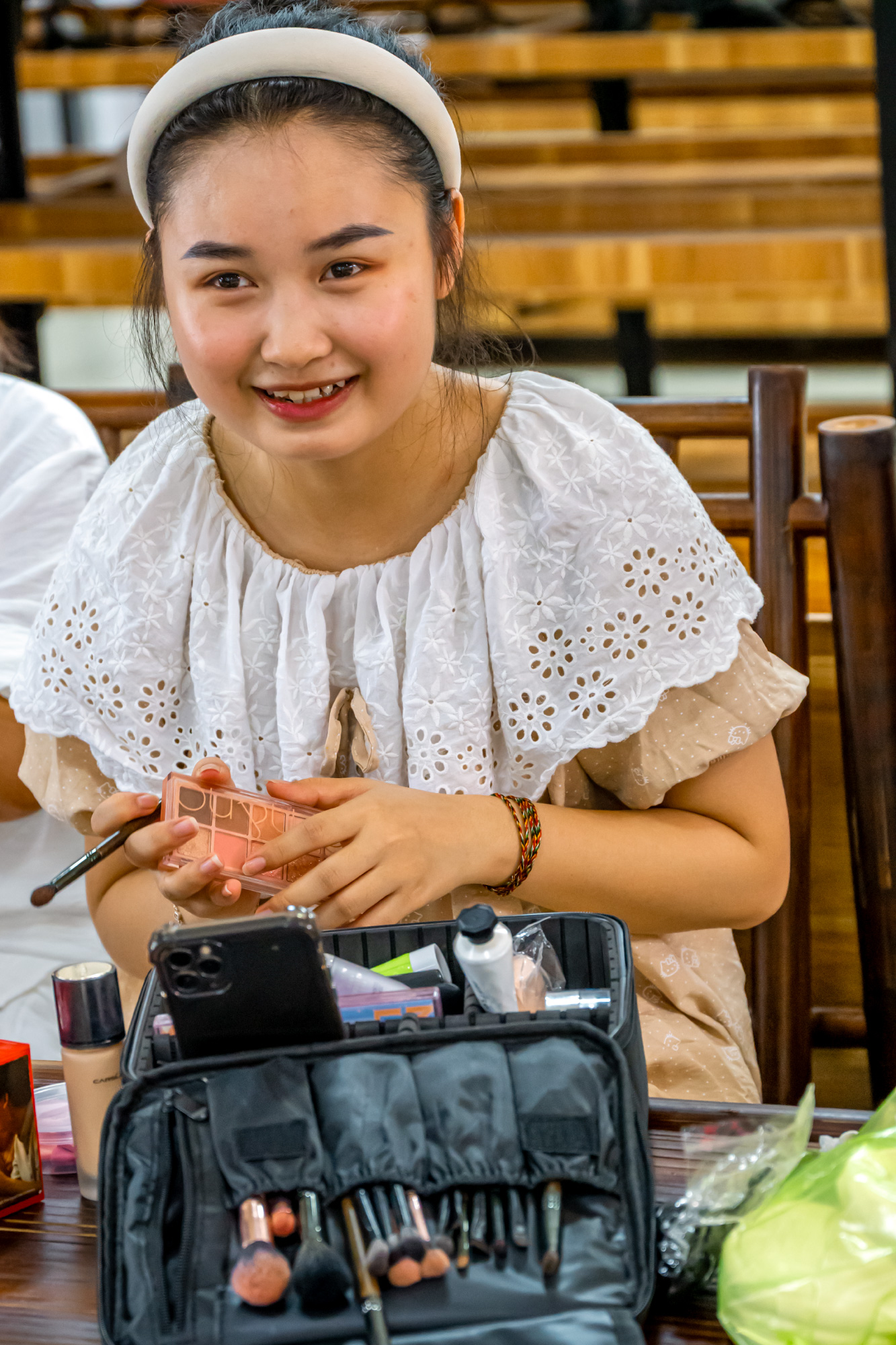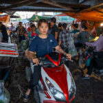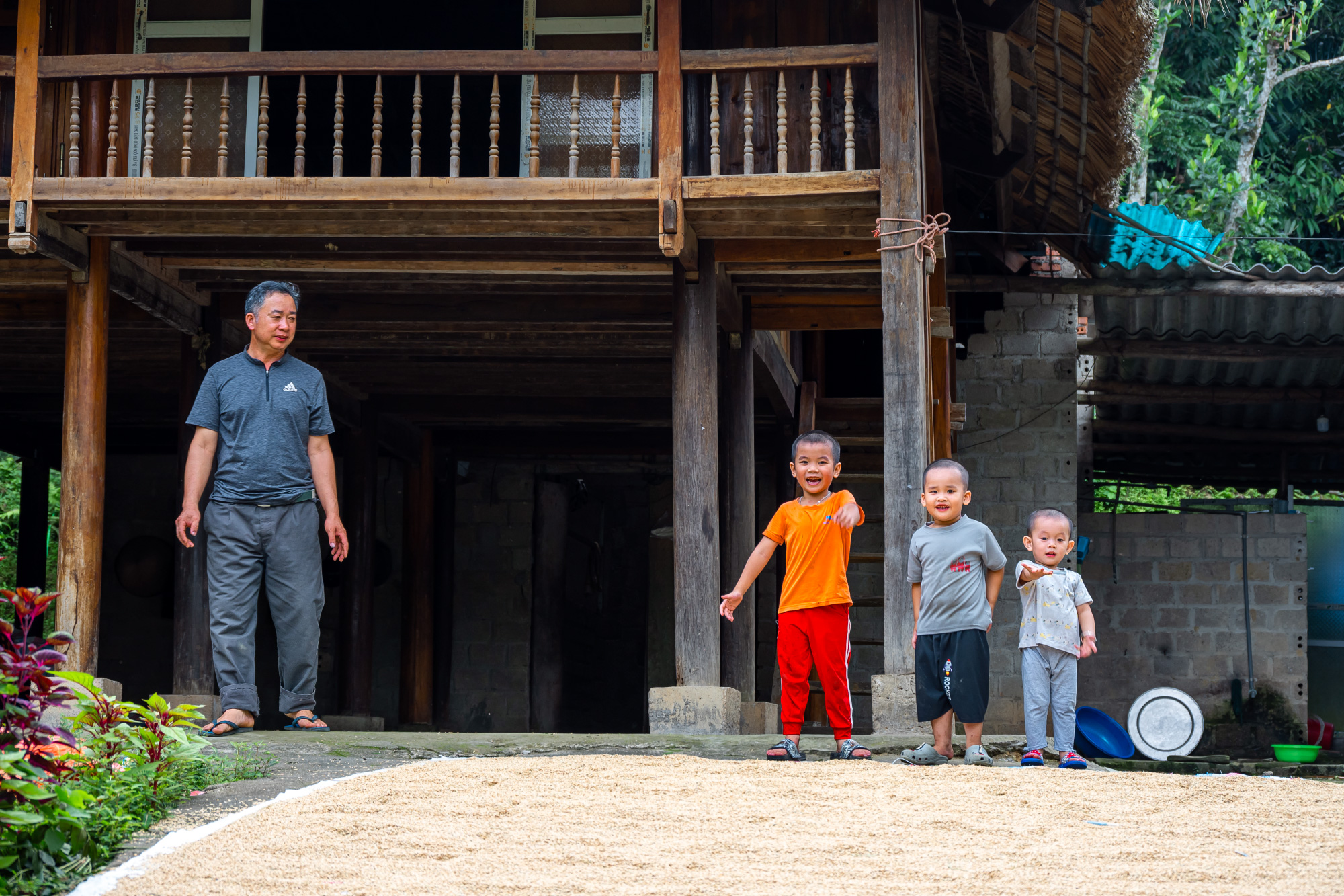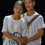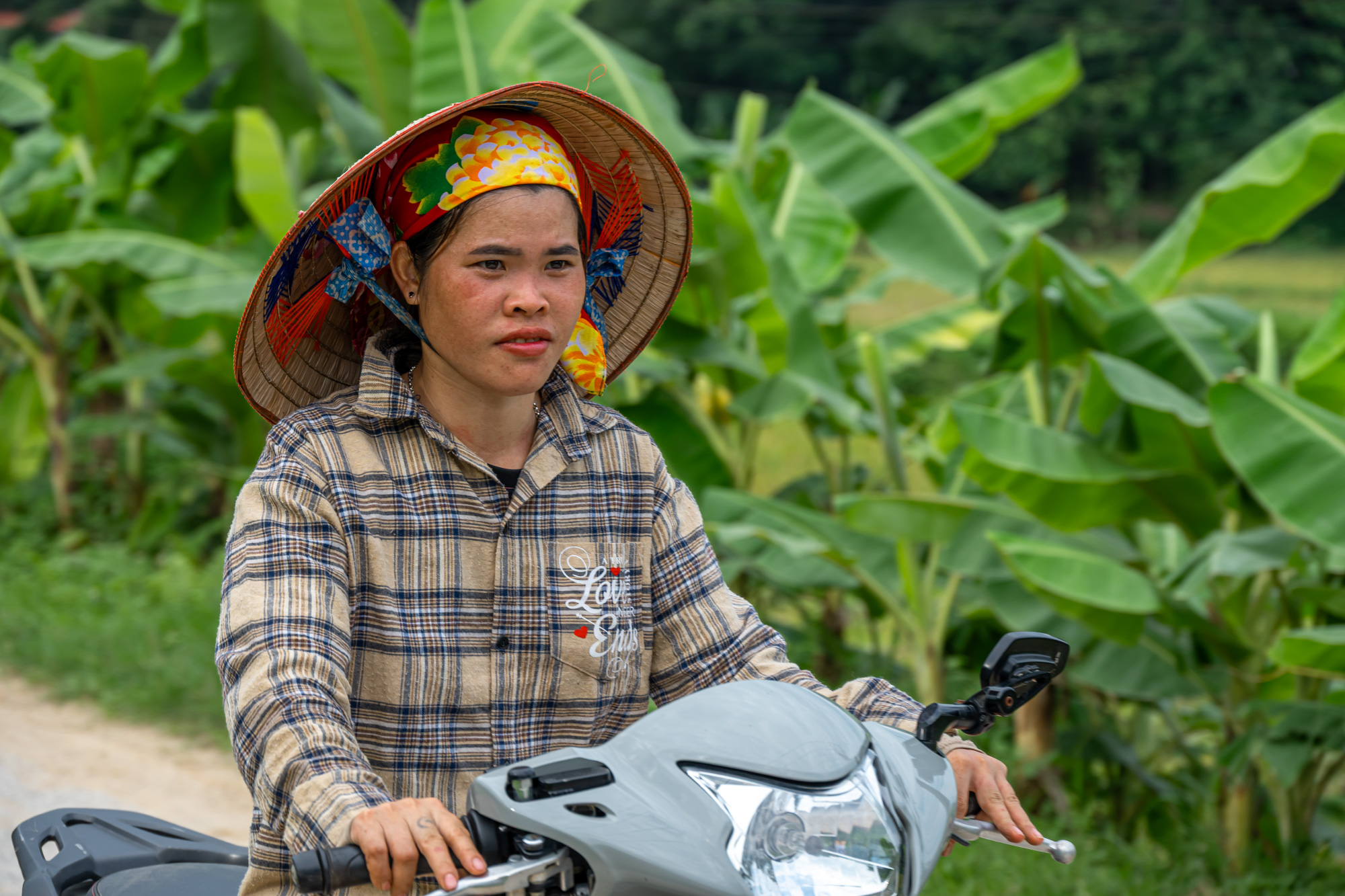 4- À ajouter un élément surprenant et intéressant. Dans le village de Xin Man, le jour du marché traditionnel une séance de studio photo élémentaire est réalisée en extérieur sur la terrasse d’un bar, en plein marché. Avec un dispositif simplifié mais efficace : un fond noir et un réflecteur lastolit, la lumière naturelle du soleil arrivant légèrement par derrière. Certes certes, mais… les modèles ??? Et bien c’est Thui qui se charge d’aller convaincre les passantes de venir poser un instant (la prise de vue dure quelques minutes). Et avec quel argument incitatif ??? Celui de repartir avec un tirage photo de 13×18 réalisé sur le champ avec une petite imprimante Canon. Et ??? Et ça marche !!! Incroyable ! Quand je vous parlais de bienveillance extraordinaire ! Ce qui n’enlève rien à la capacité de persuasion de Thui.🤪 Bien sûr certain(e) ont refusé mais à ce que j’ai vu, c’était plus pour des raisons de « programme personnel » : elle avait terminé le marché, tenait à bout de bras, des sacs et des sacs de marchandises et une poule et… était pressée de rentrer chez elle.