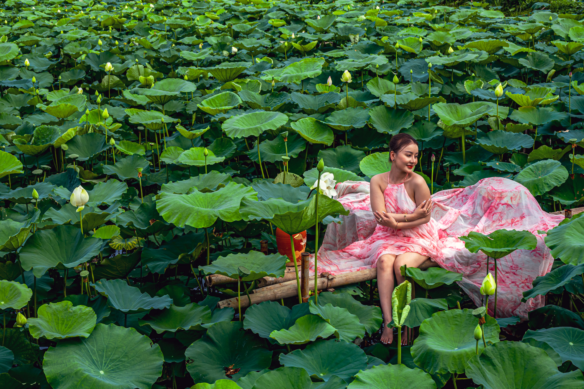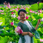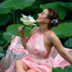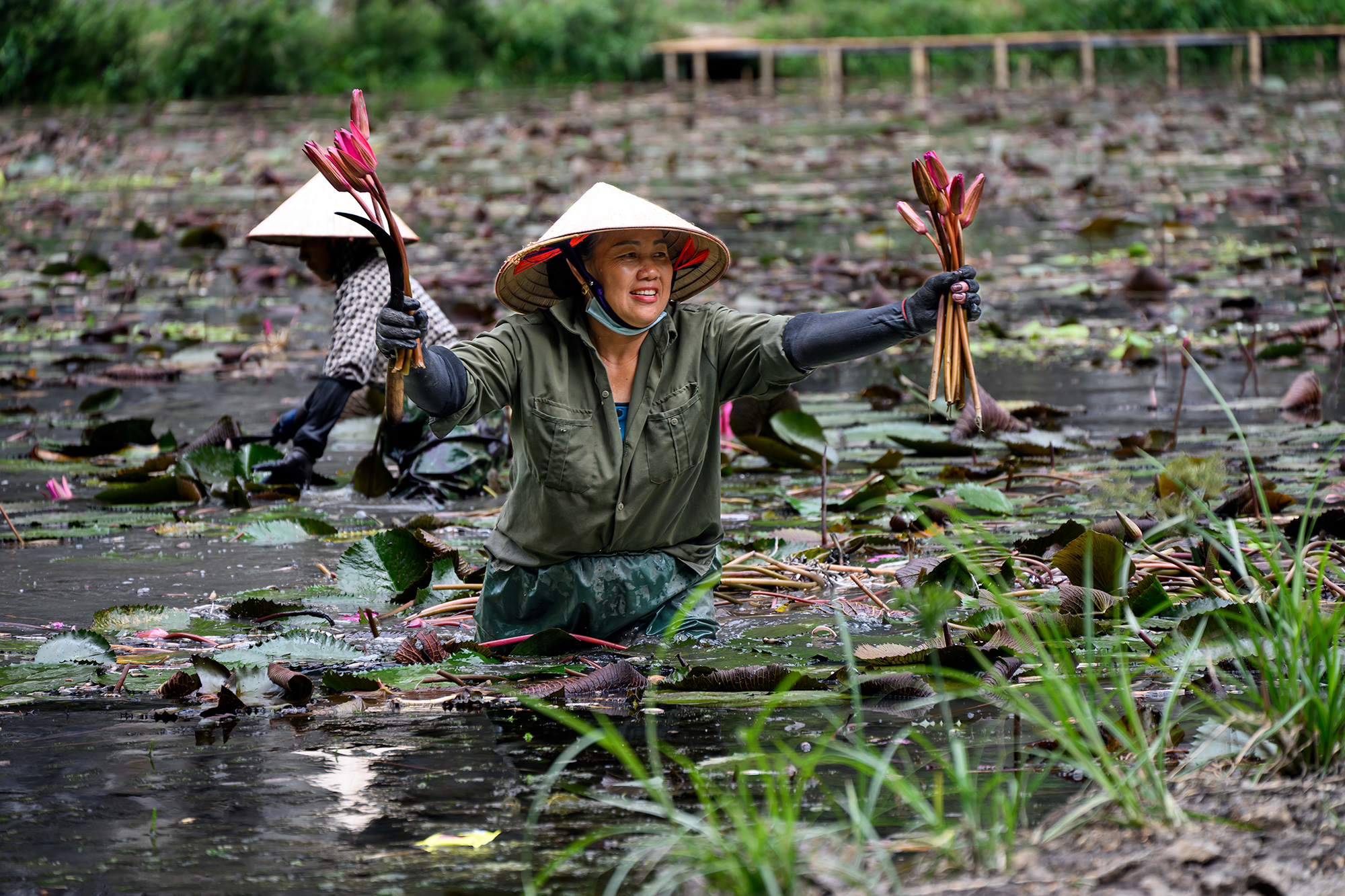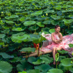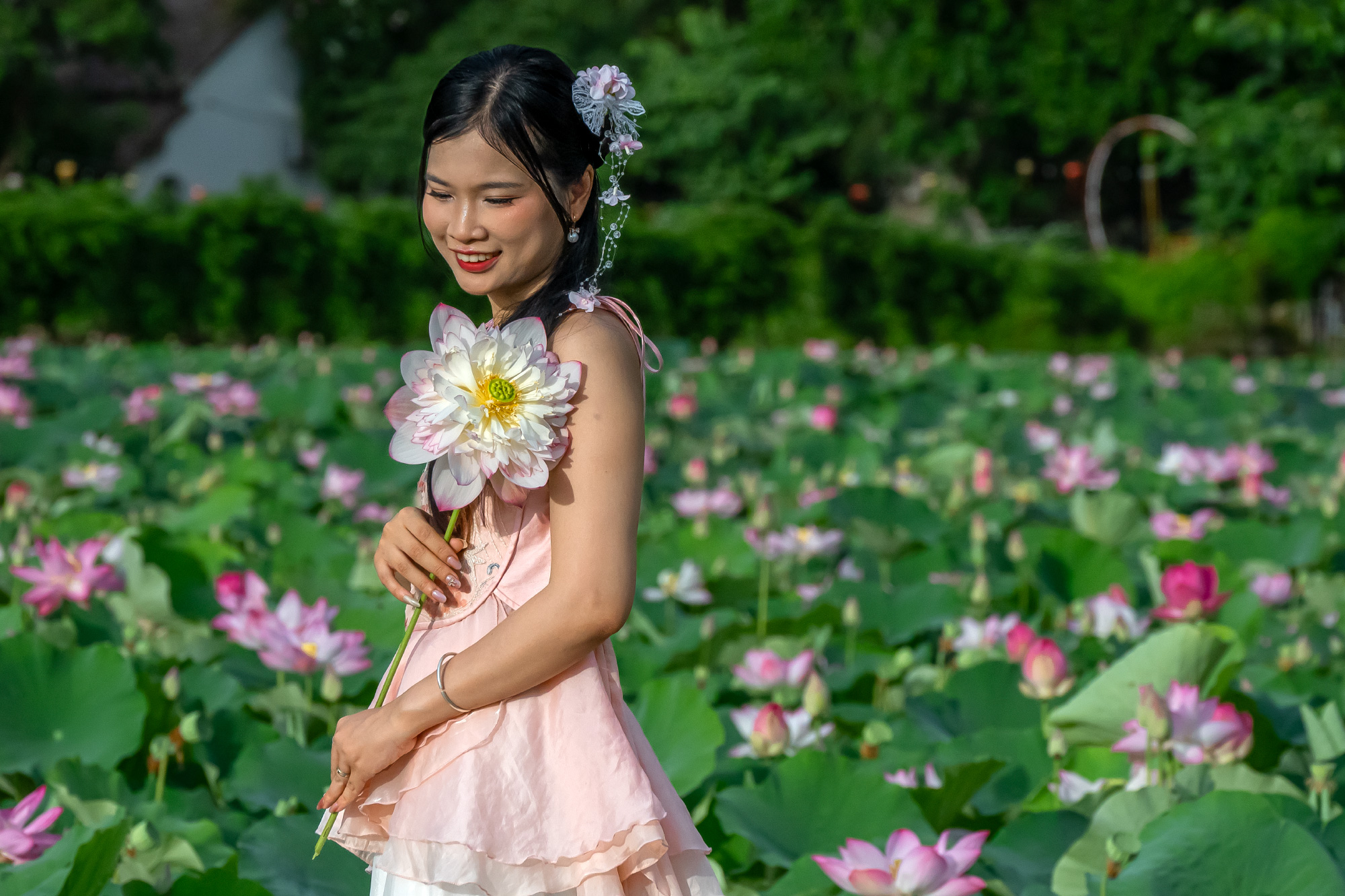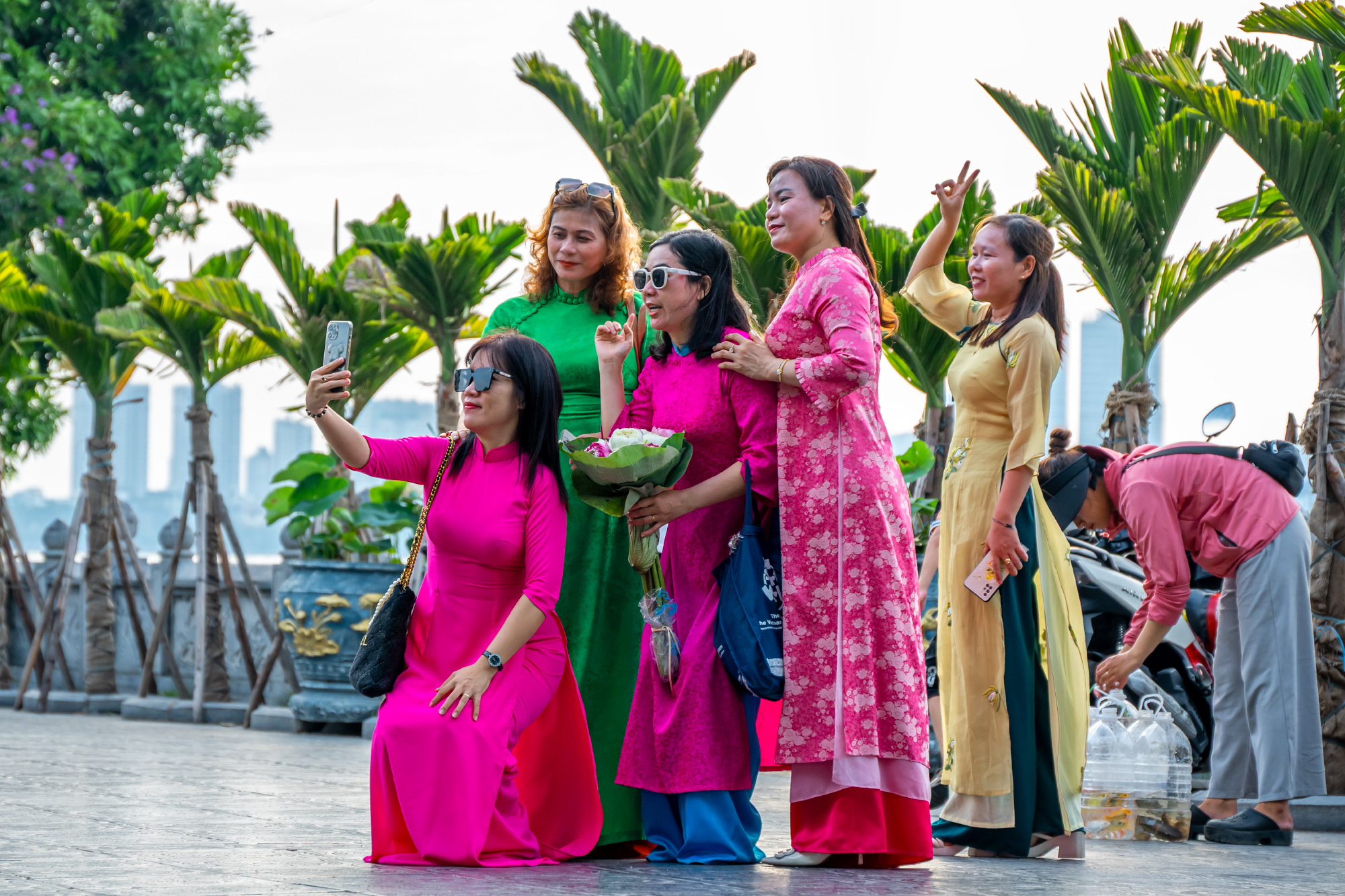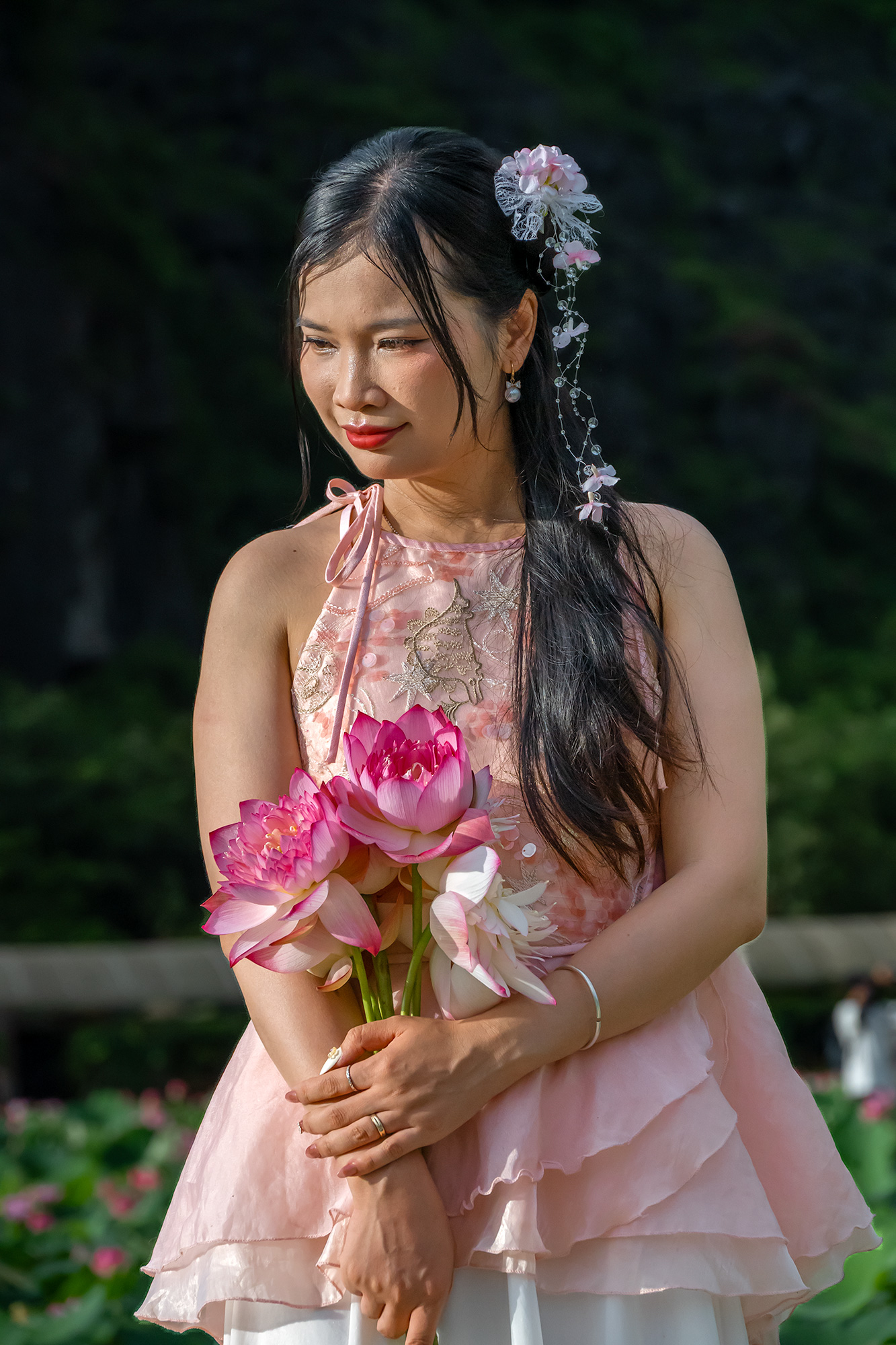 3- Et puis, il y a les interminables séances photos dans les vastes étendues de lotus du lac Hô Hoàn Kièm Hanoï ou à Hang Mua à Ninh Binh. Cela relève de l’institution ! Tout comme je l’ai signalé au Wat Arun de Bangkok, les belles viennent prendre des poses parmi les magnifiques lotus, dûment maquillées et bijoutées, dans de somptueux habits traditionnels, souvent loués pour la circonstance et souvent accompagnées de photographes professionnels. Et là, pendant des heures elles prennent des poses, des poses et… des poses. Comment ne pas profiter de l’aubaine !